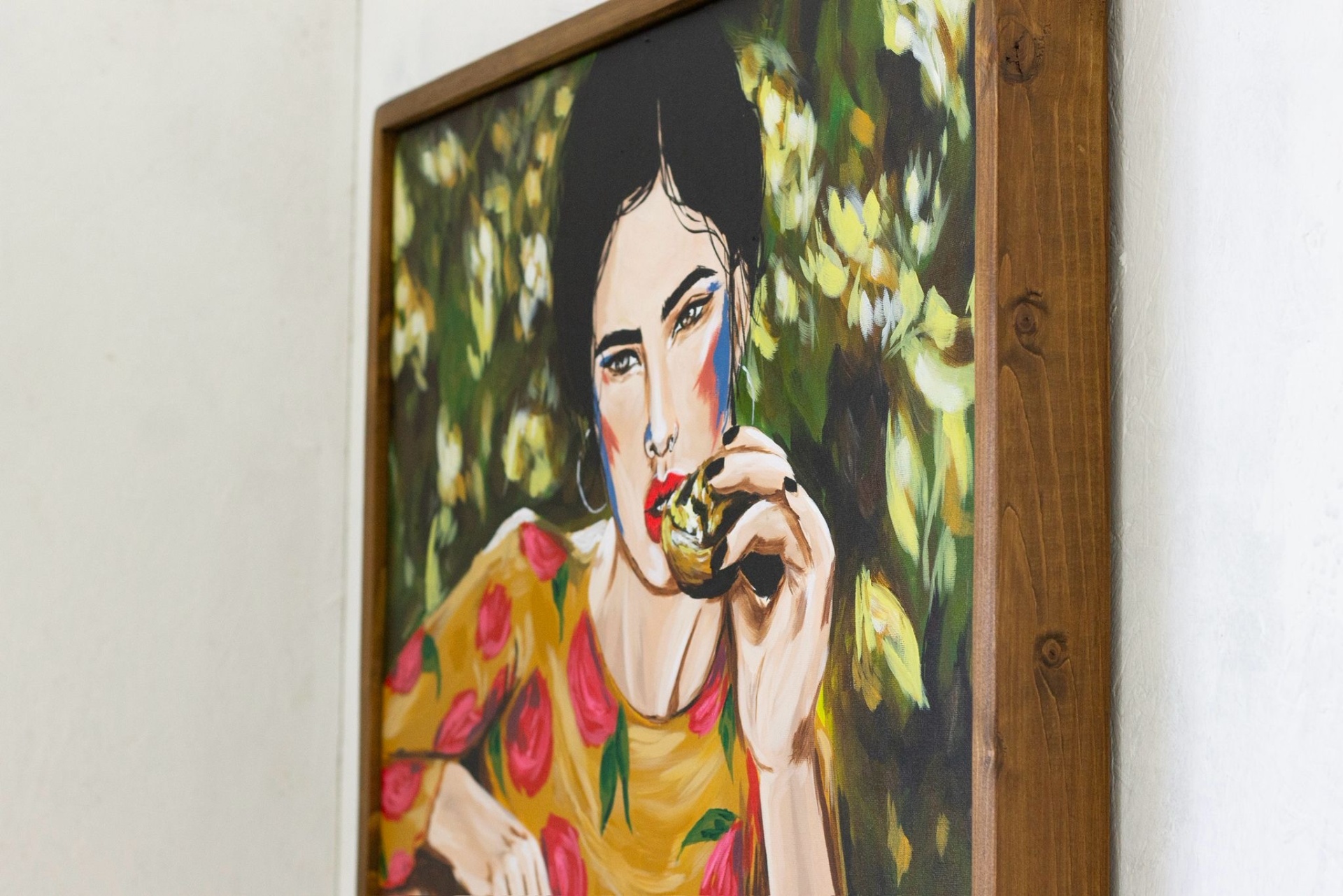 • Pintura de mulher com roupa florida segurando fruto, moldura de madeira
