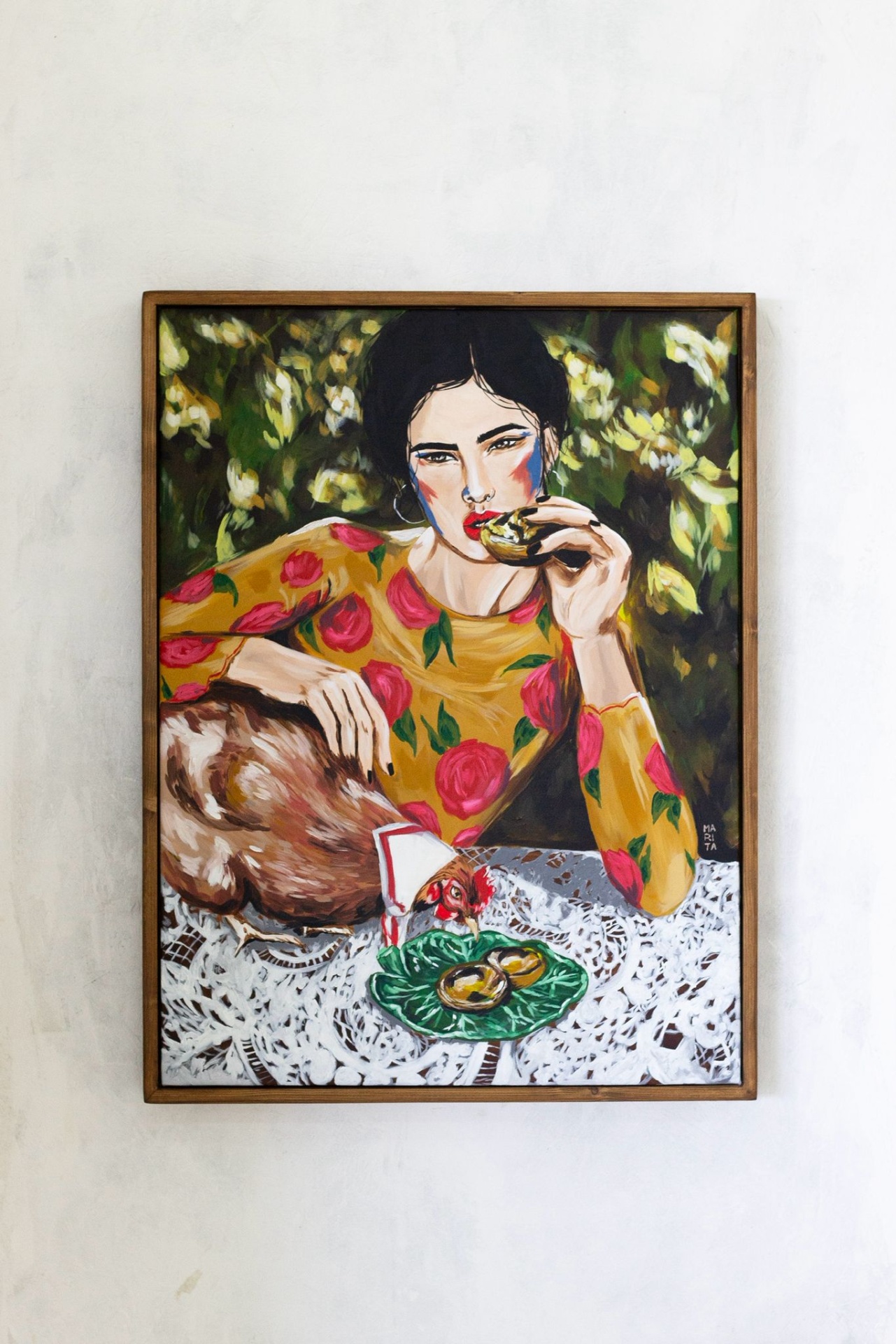 • Pintura de mulher com vestido amarelo florido a comer com galinha num prato verde sobre toalha branca