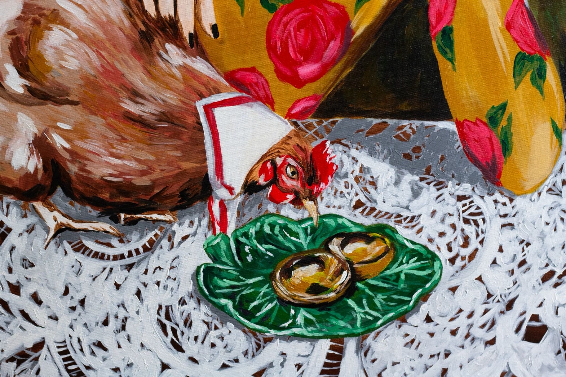 • Pintura de galinha com prato verde em toalha de renda e fundo floral