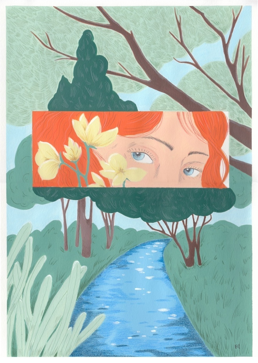 • Ilustração de rio com vegetação e rosto de mulher ruiva com flores amarelas