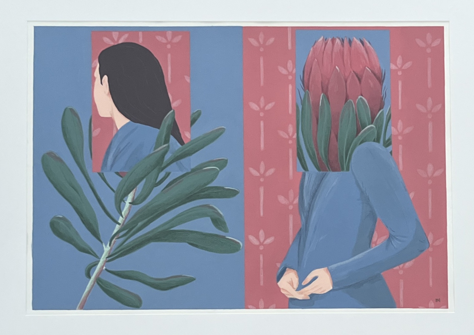 • Ilustração com figura feminina e elementos florais em fundo azul e rosa