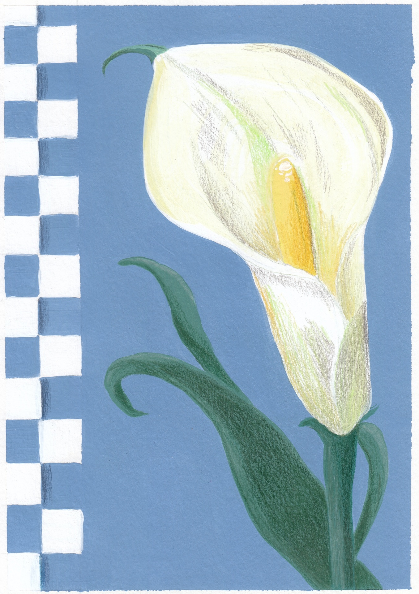 Desenho de flor de copo-de-leite com fundo azul e padrão de quadrados brancos.