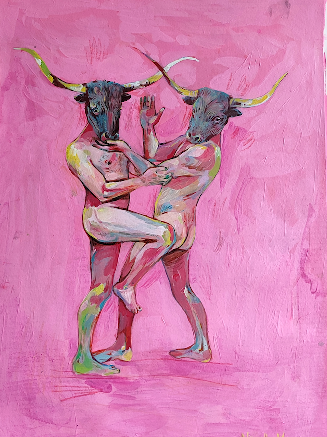 • Pintura de duas figuras humanas com cabeças de touro e fundo rosa