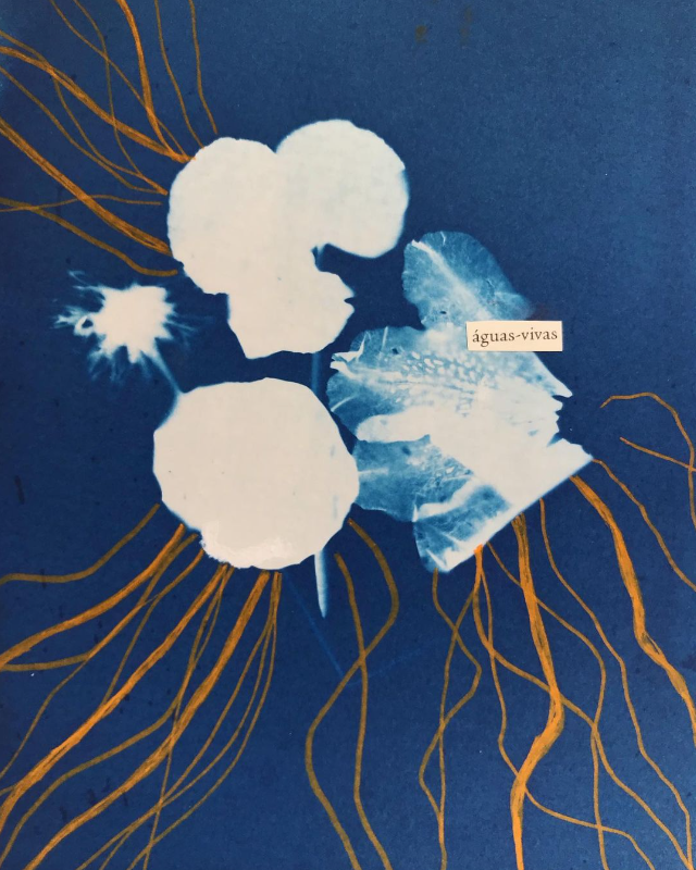 • Arte em fundo azul com formas brancas e linhas amarelas, palavra 'águas-vivas' visível.