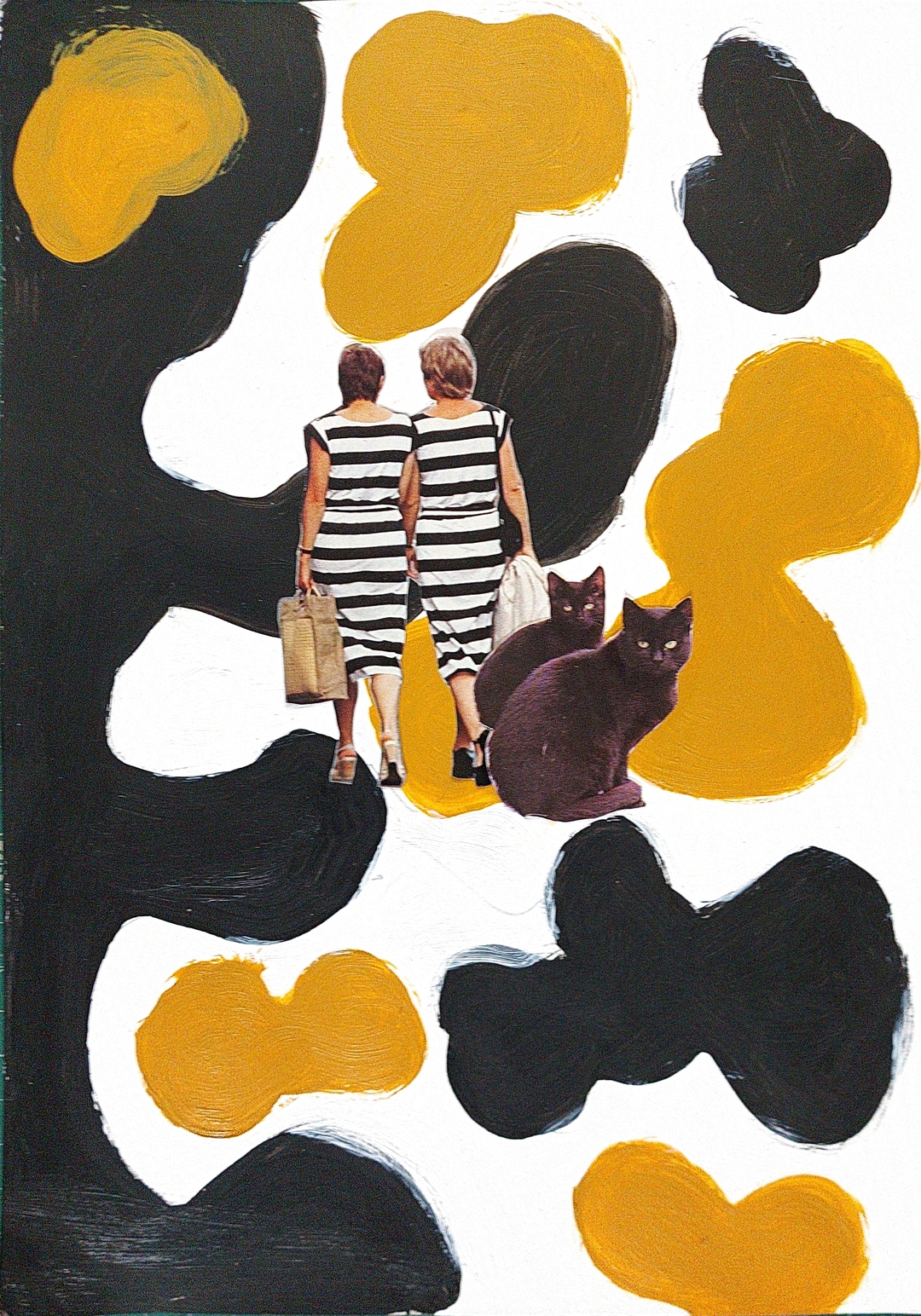 • Duas mulheres de costas com vestidos às riscas e dois gatos pretos sobre fundo abstrato preto e amarelo