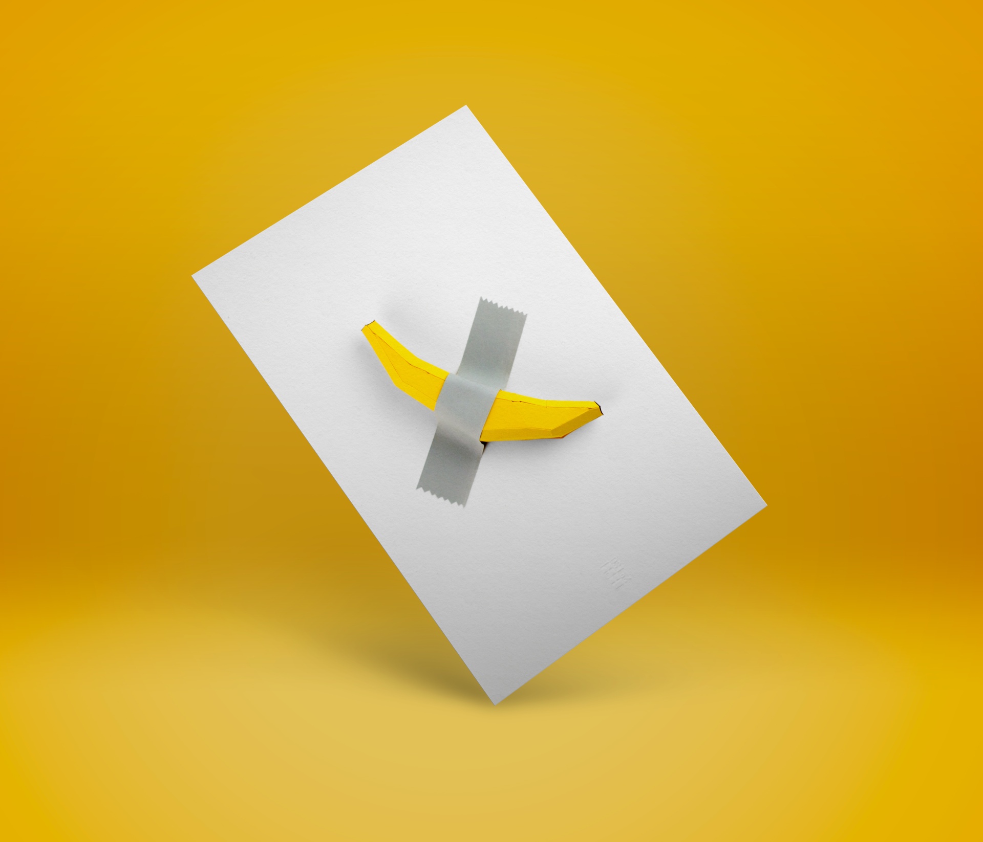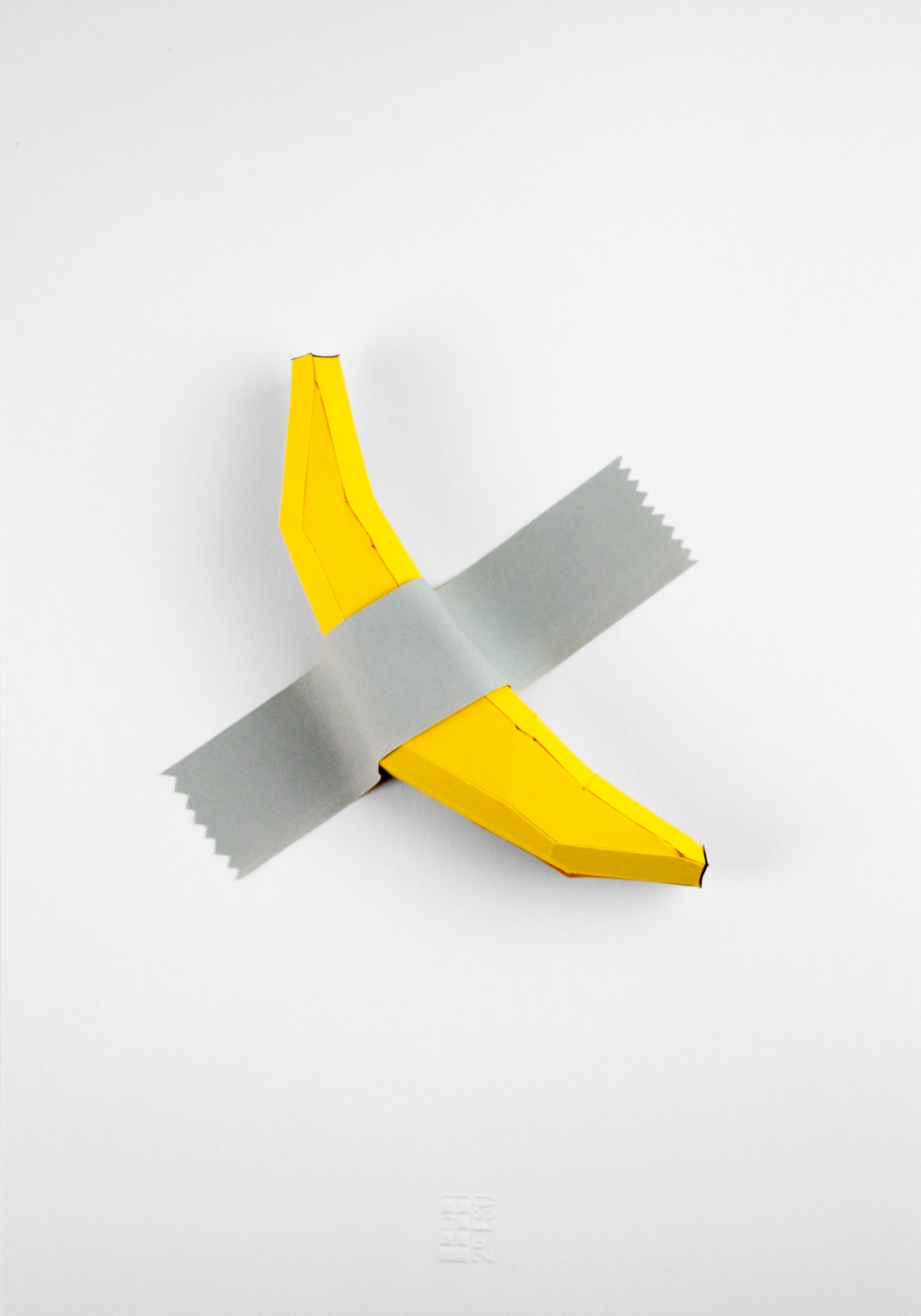 • Banana amarela de papel presa com fita prateada numa parede branca