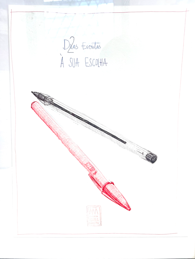 • Folha branca com desenho de duas canetas e texto escrito à mão