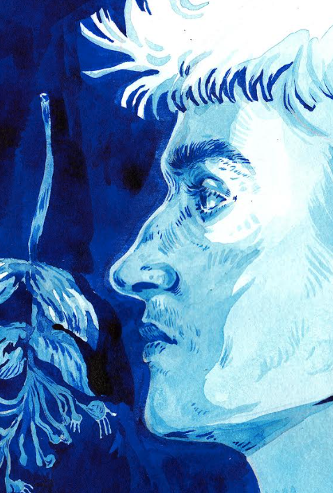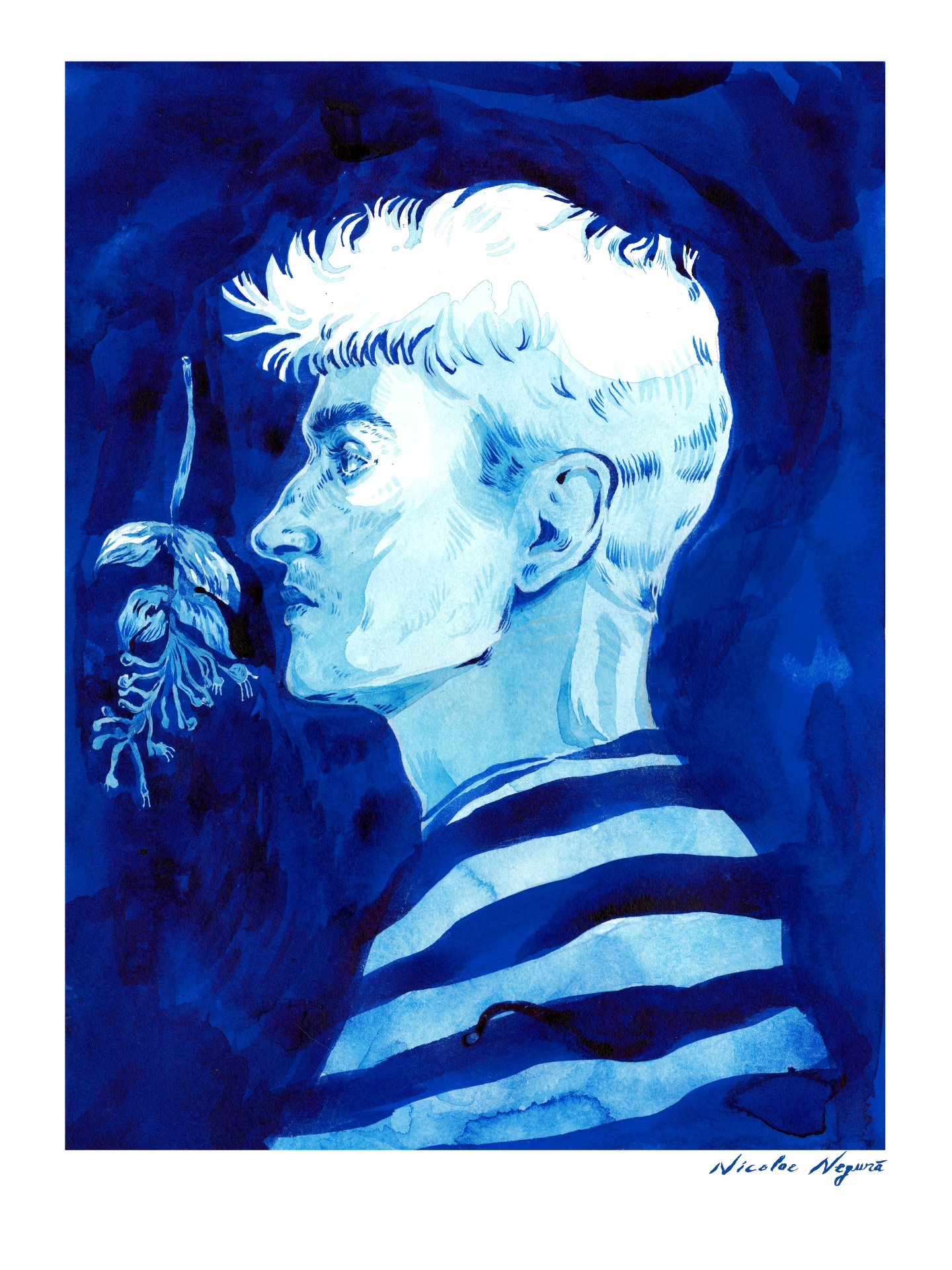• Desenho em azul do perfil de um homem com planta ao lado