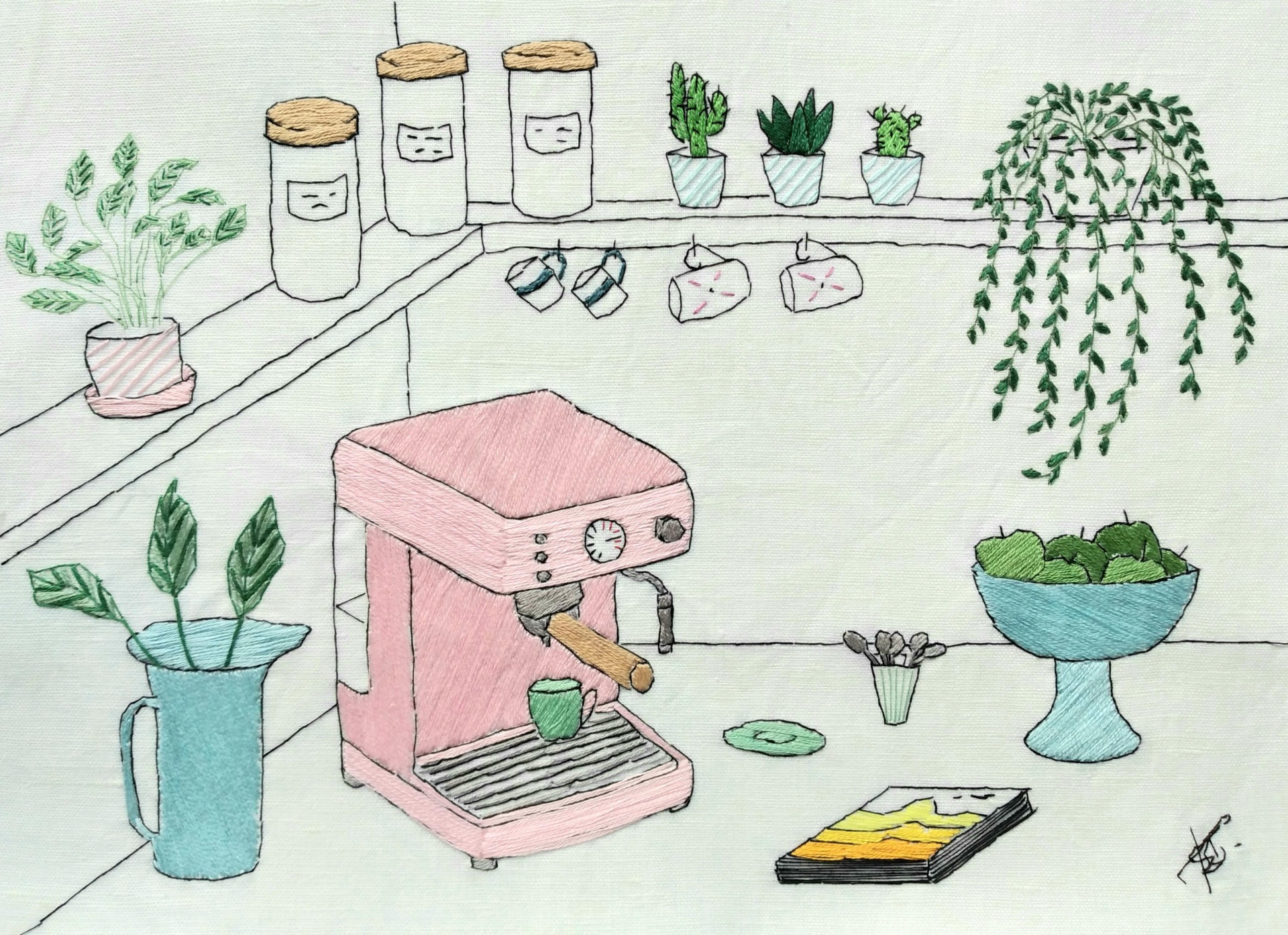 • Ilustração de cozinha com máquina de café rosa, plantas, chaleira azul e fatias de bolo.