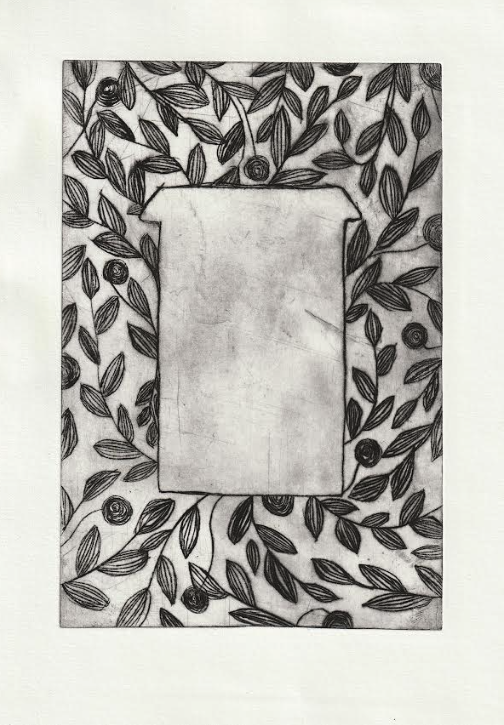 • Ilustração preta e branca com retângulo central e padrão de folhas
