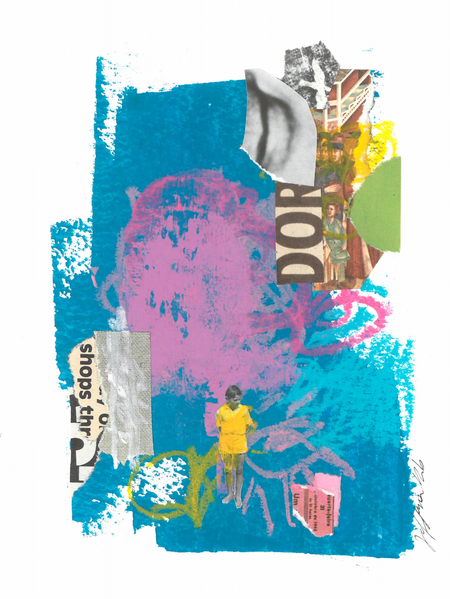 • Colagem azul, rosa e amarelo com recortes de jornais, criança e texto DOR