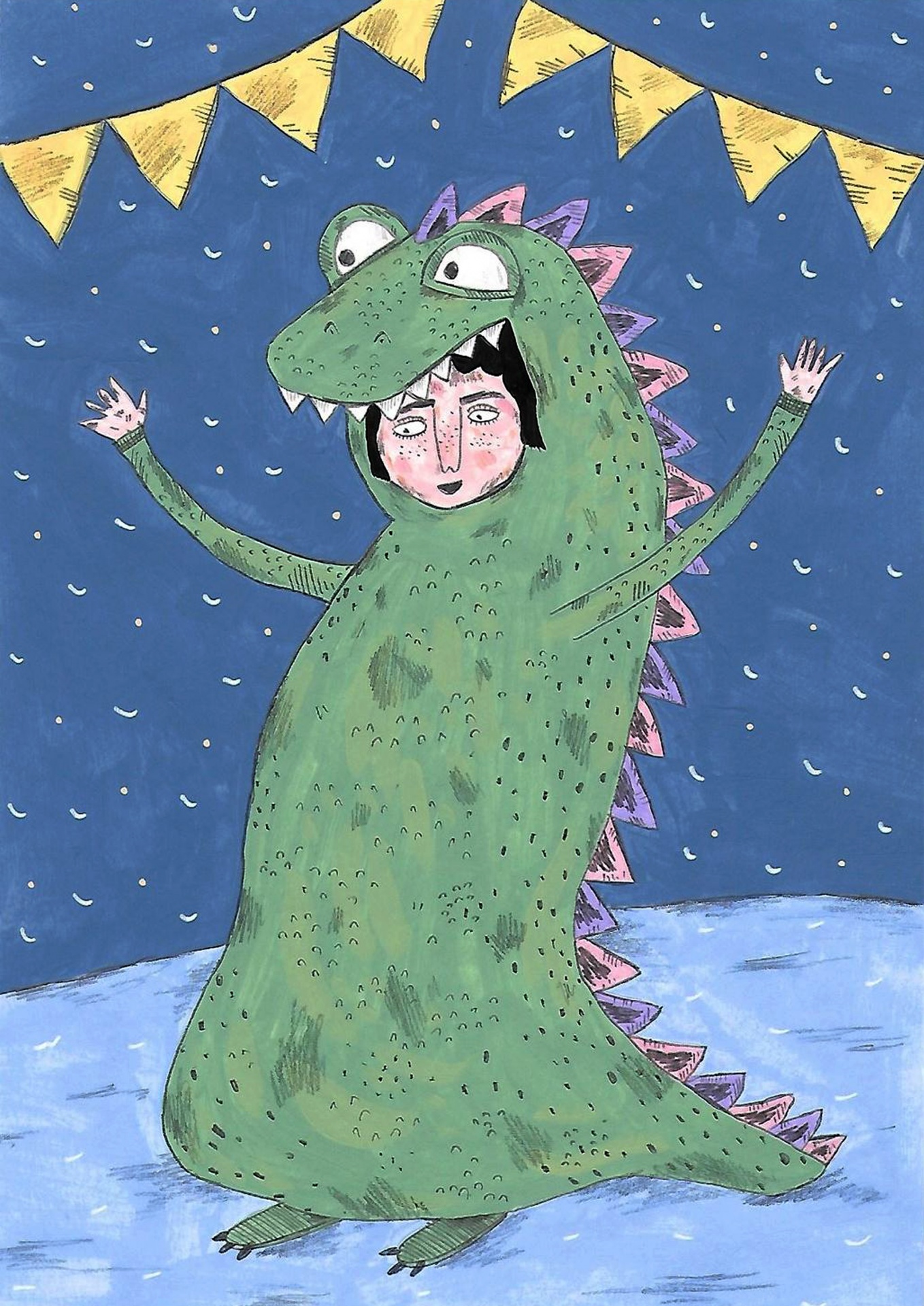 • Pessoa com fato de dinossauro verde com olhos grandes e dentes, fundo azul com bandeiras amarelas.