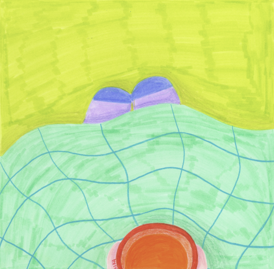 • Chávena laranja sobre pires rosa com manta verde e sapatilhas roxas ao fundo