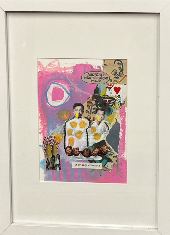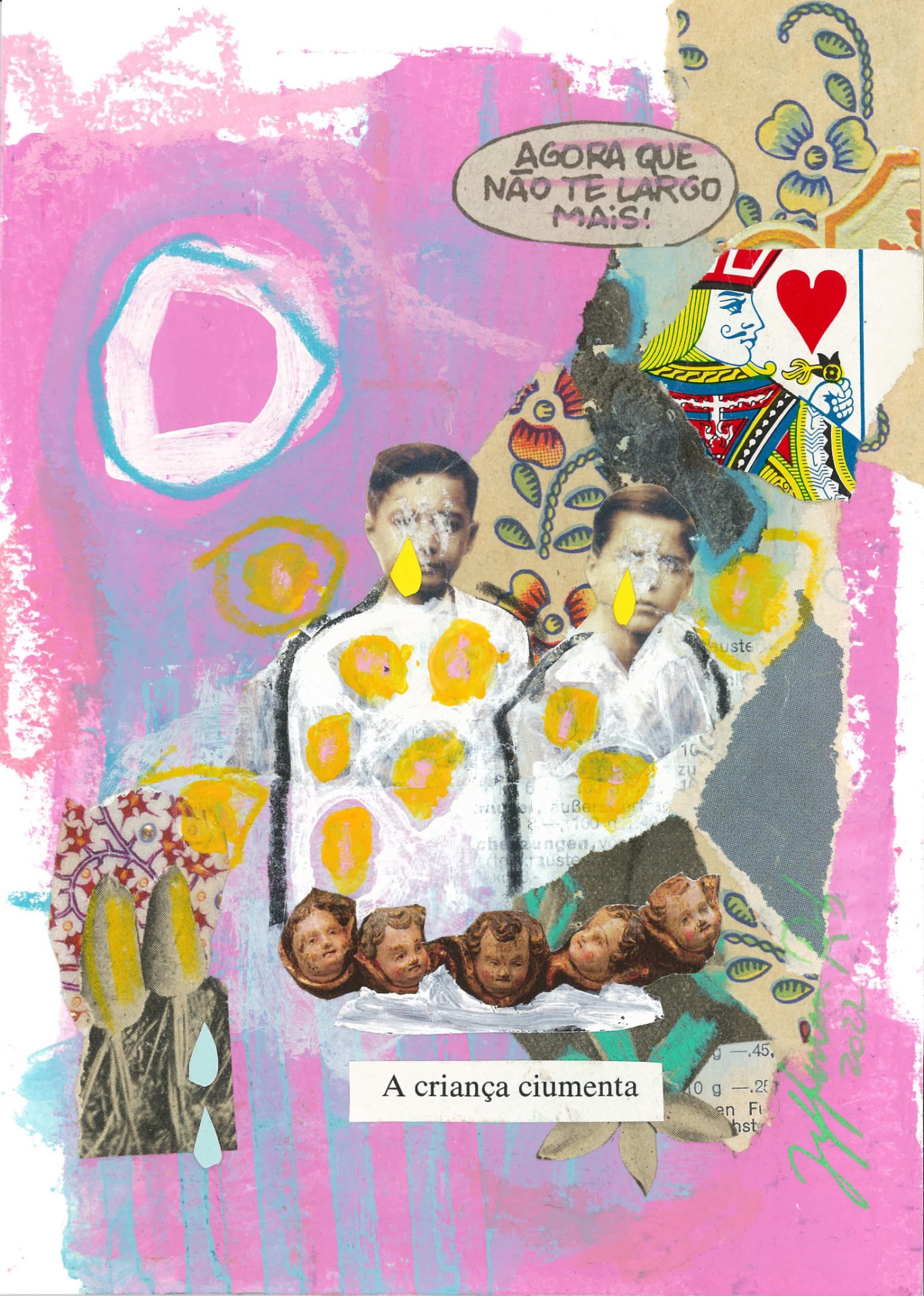 • Colagem artística com figuras humanas, cartas de baralho, texto em português e padrões florais