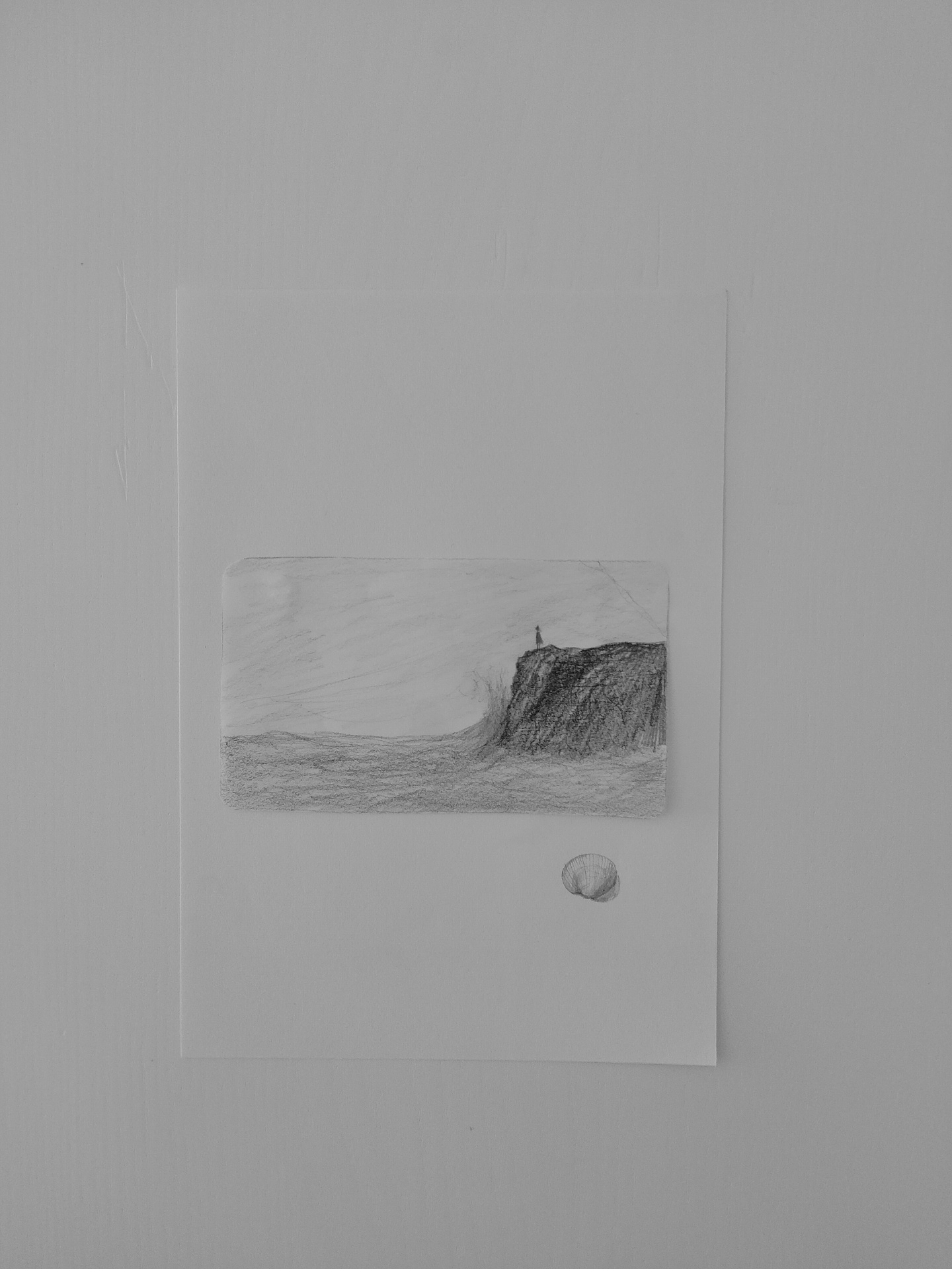 • Desenho a lápis de paisagem com penhasco e mar
