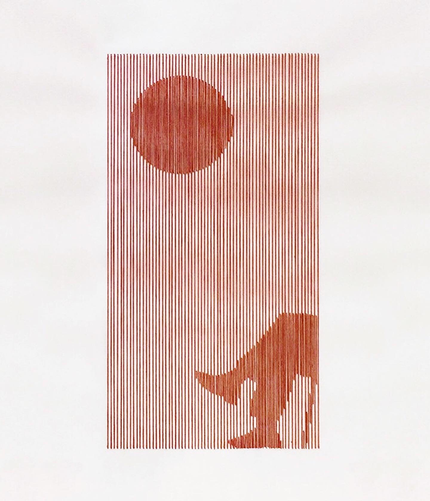 • Arte gráfica em vermelho com linhas verticais, círculo e silhueta sentada