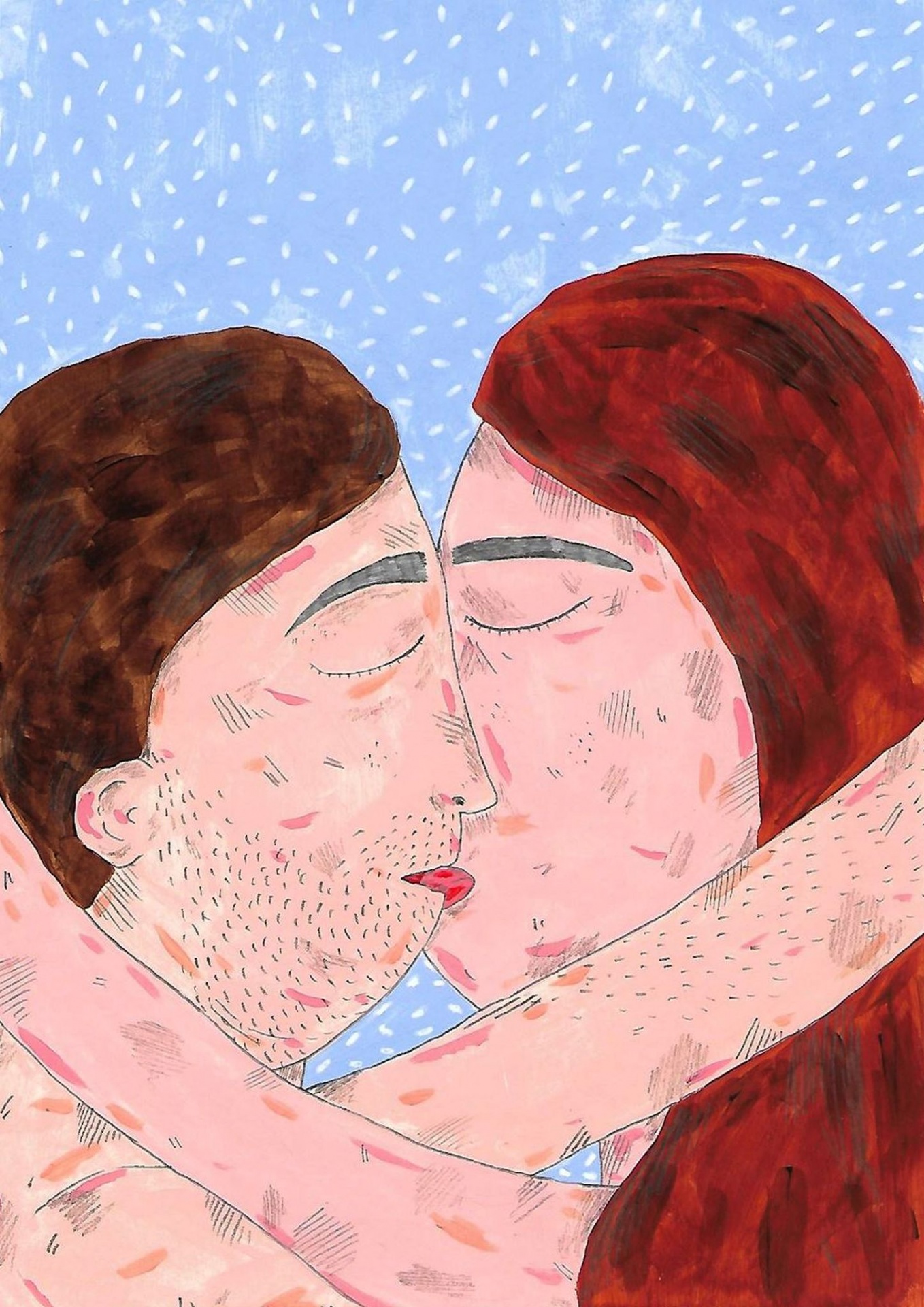 • Ilustração colorida de casal a beijar-se com fundo azul e detalhes brancos