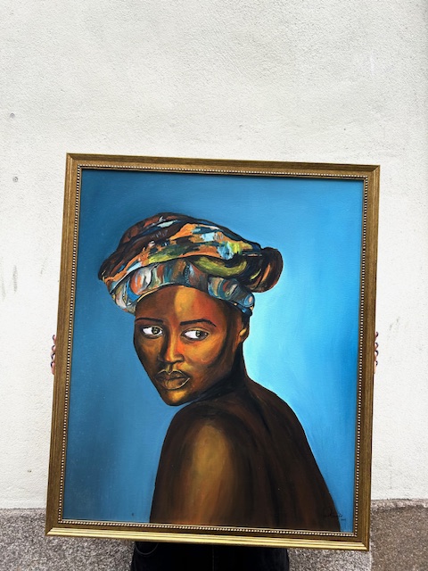 • Pintura em moldura dourada de mulher negra com turbante colorido e fundo azul
