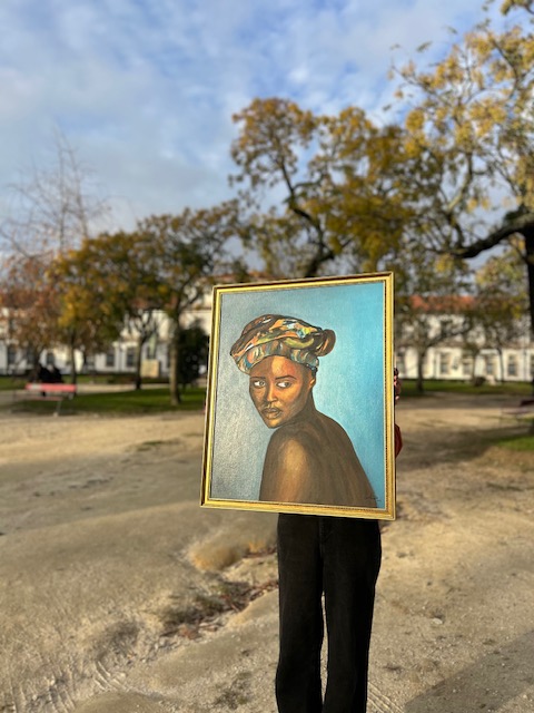 • Pintura de retrato feminino com turbante colorido em moldura dourada ao ar livre