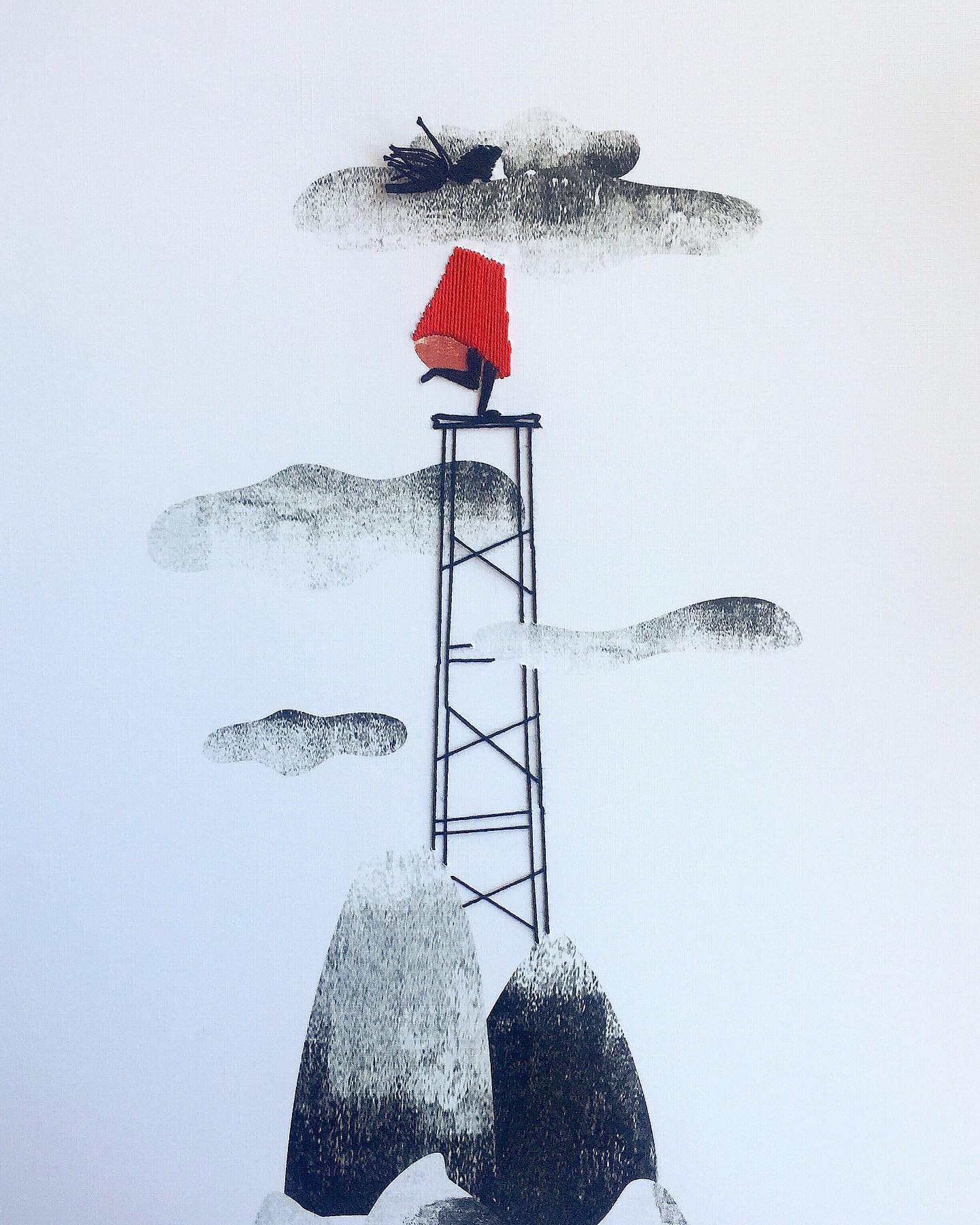 • Desenho abstrato de estrutura metálica com pessoa vestida de vermelho no topo entre nuvens cinzentas e rochas escuras.