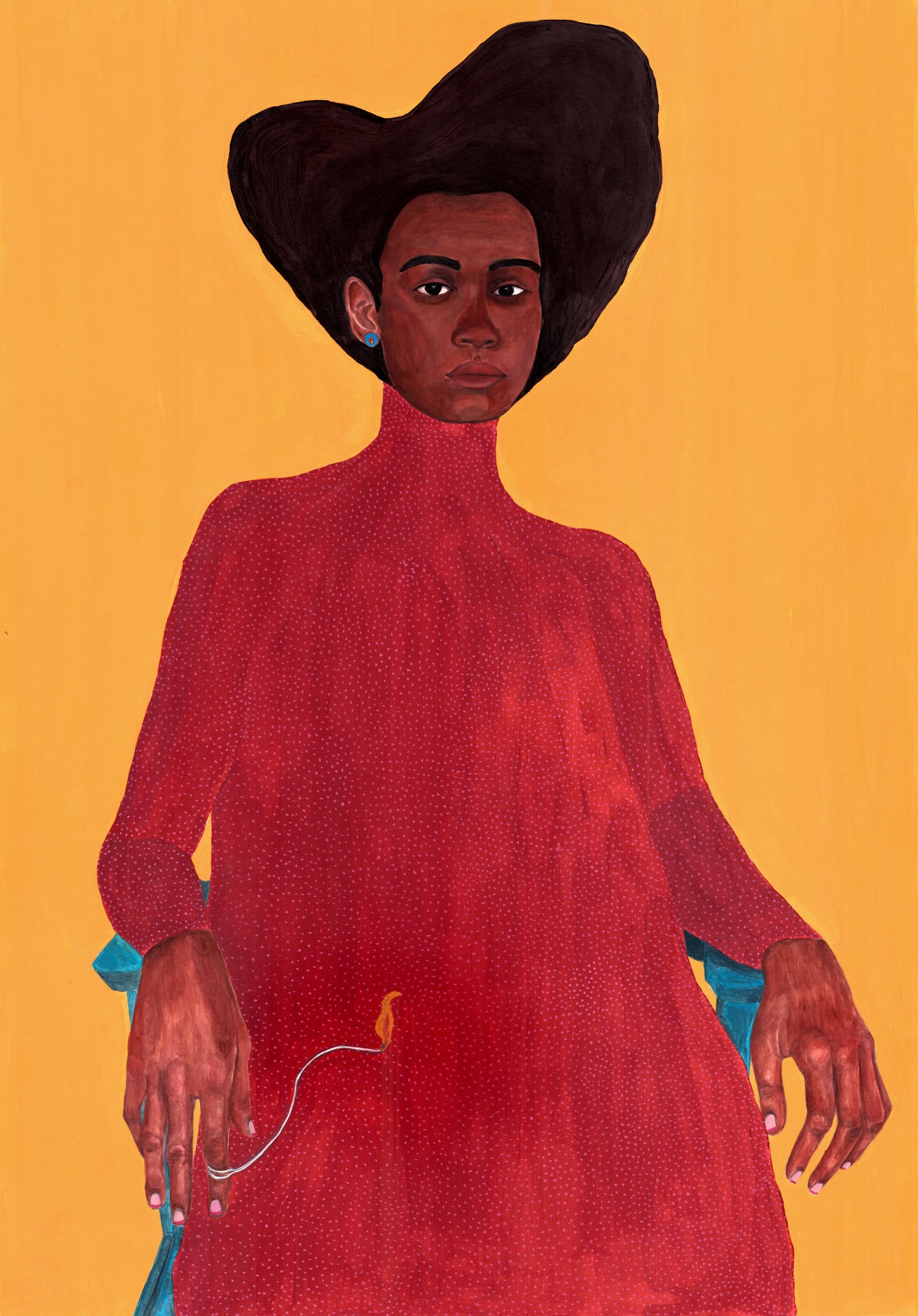 Retrato de mulher com vestido vermelho e cabelo volumoso, sentada em cadeira azul, fundo laranja