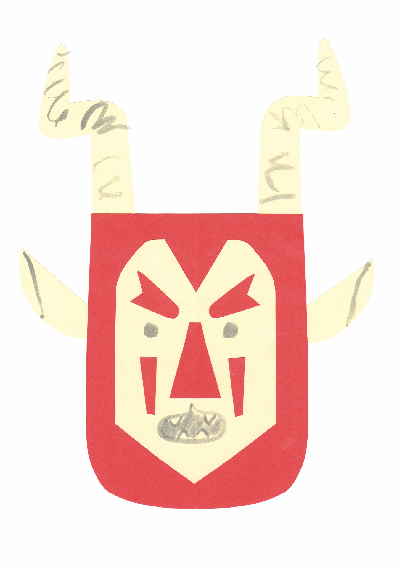 • Máscara de papel vermelho e bege com chifres e expressão feroz