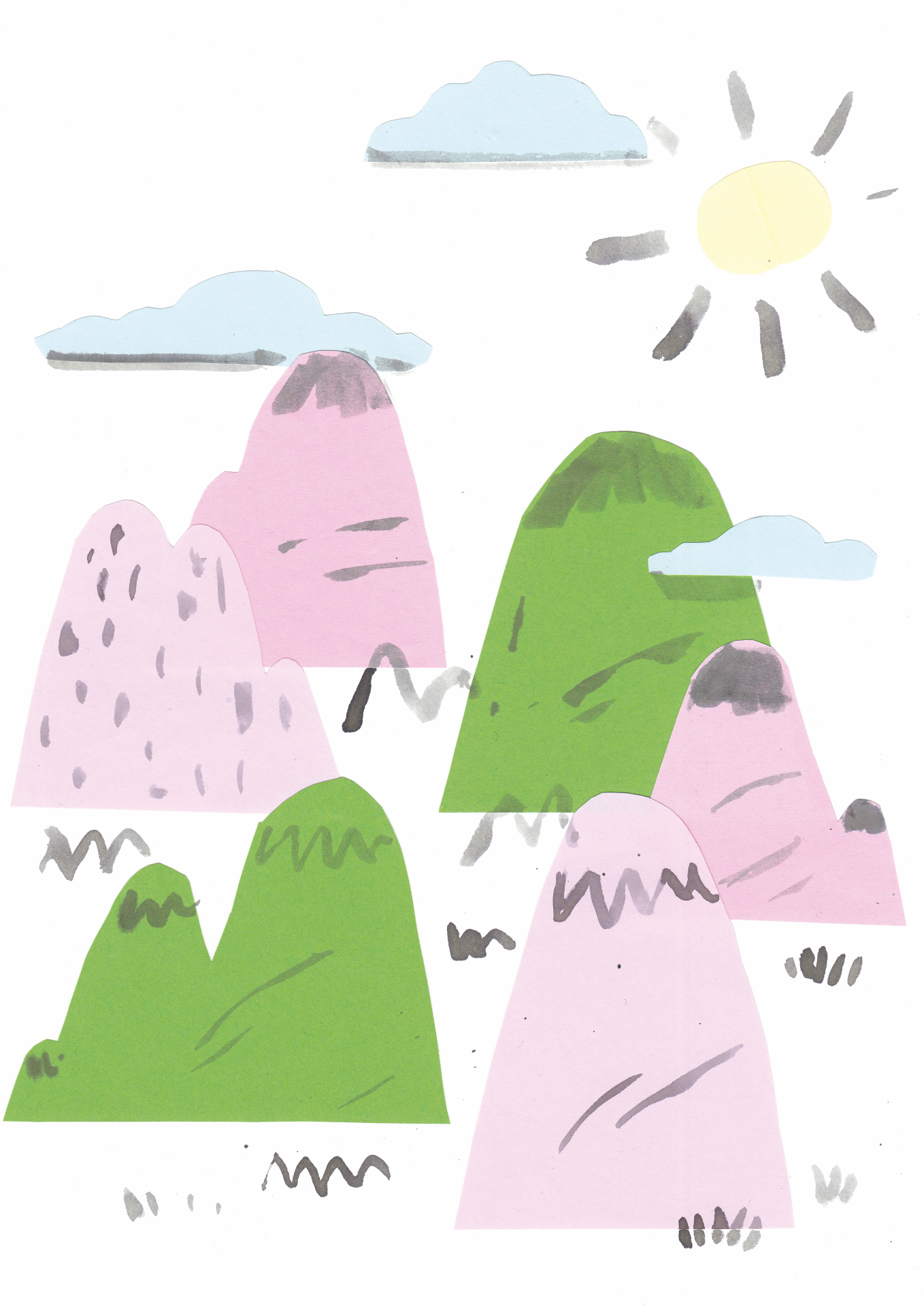 • Ilustração de montanhas coloridas e céu com sol e nuvens