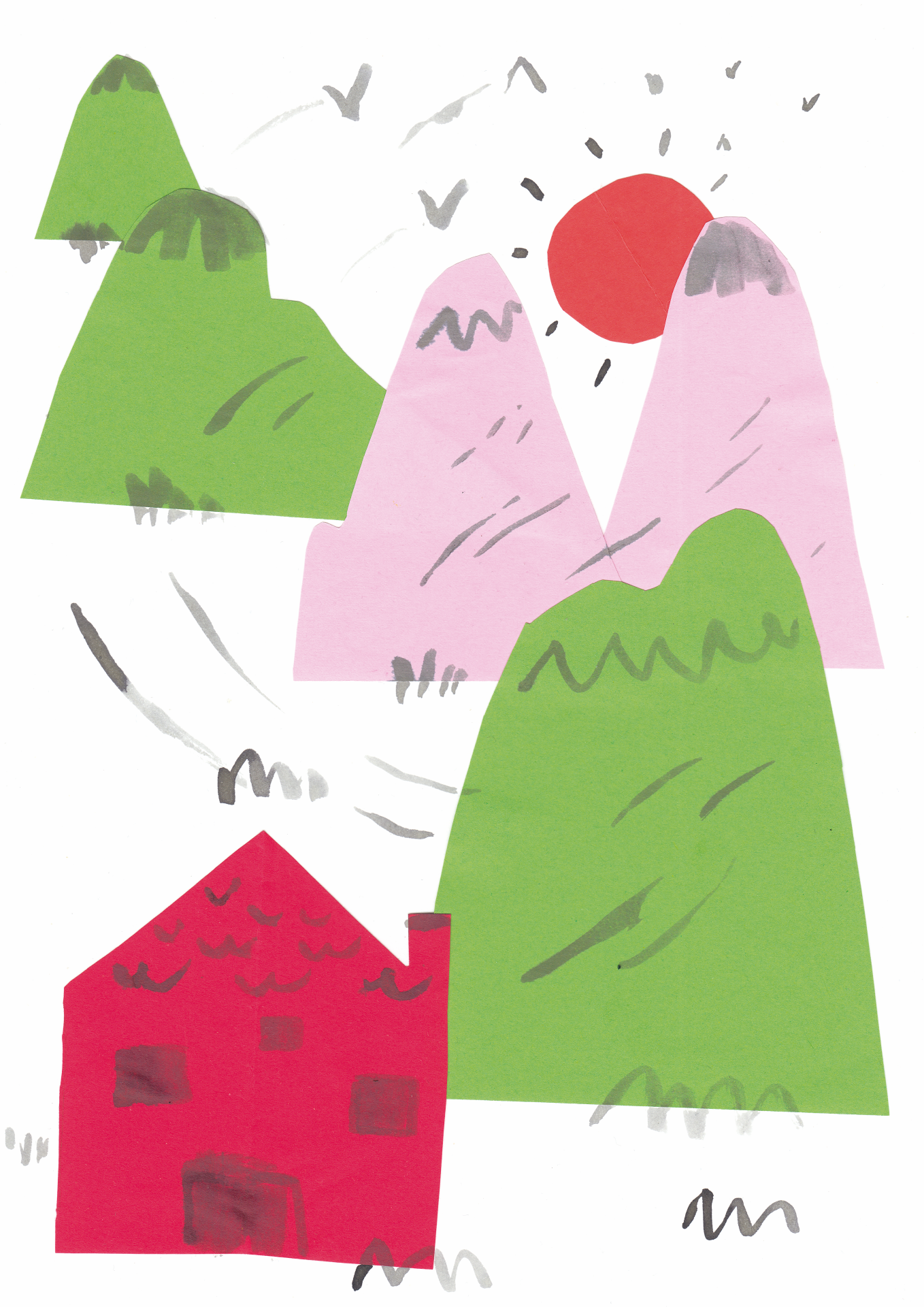 • Desenho de casa vermelha e montanhas coloridas em papel recortado