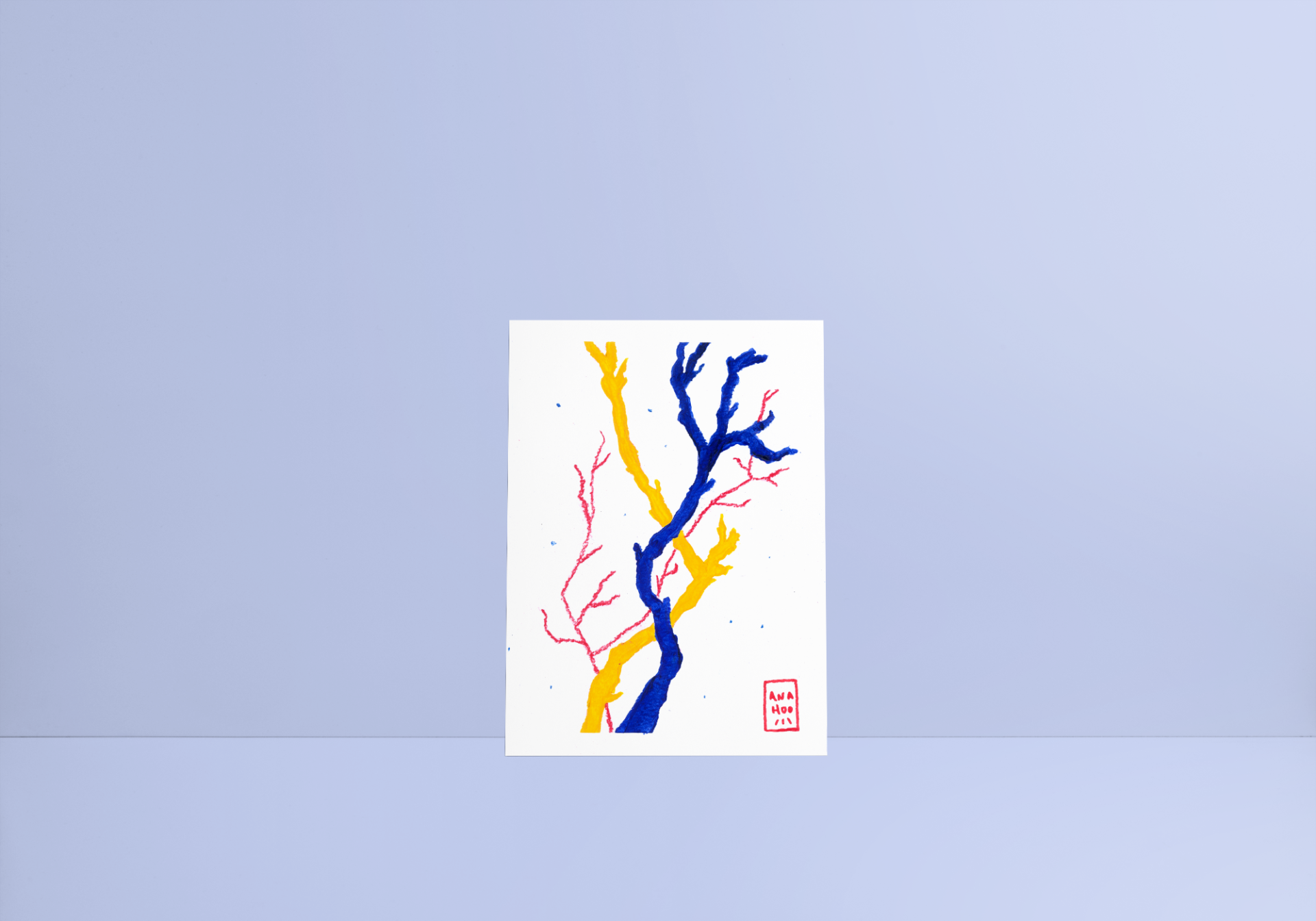 • Ilustração com ramos coloridos em papel branco contra parede azul