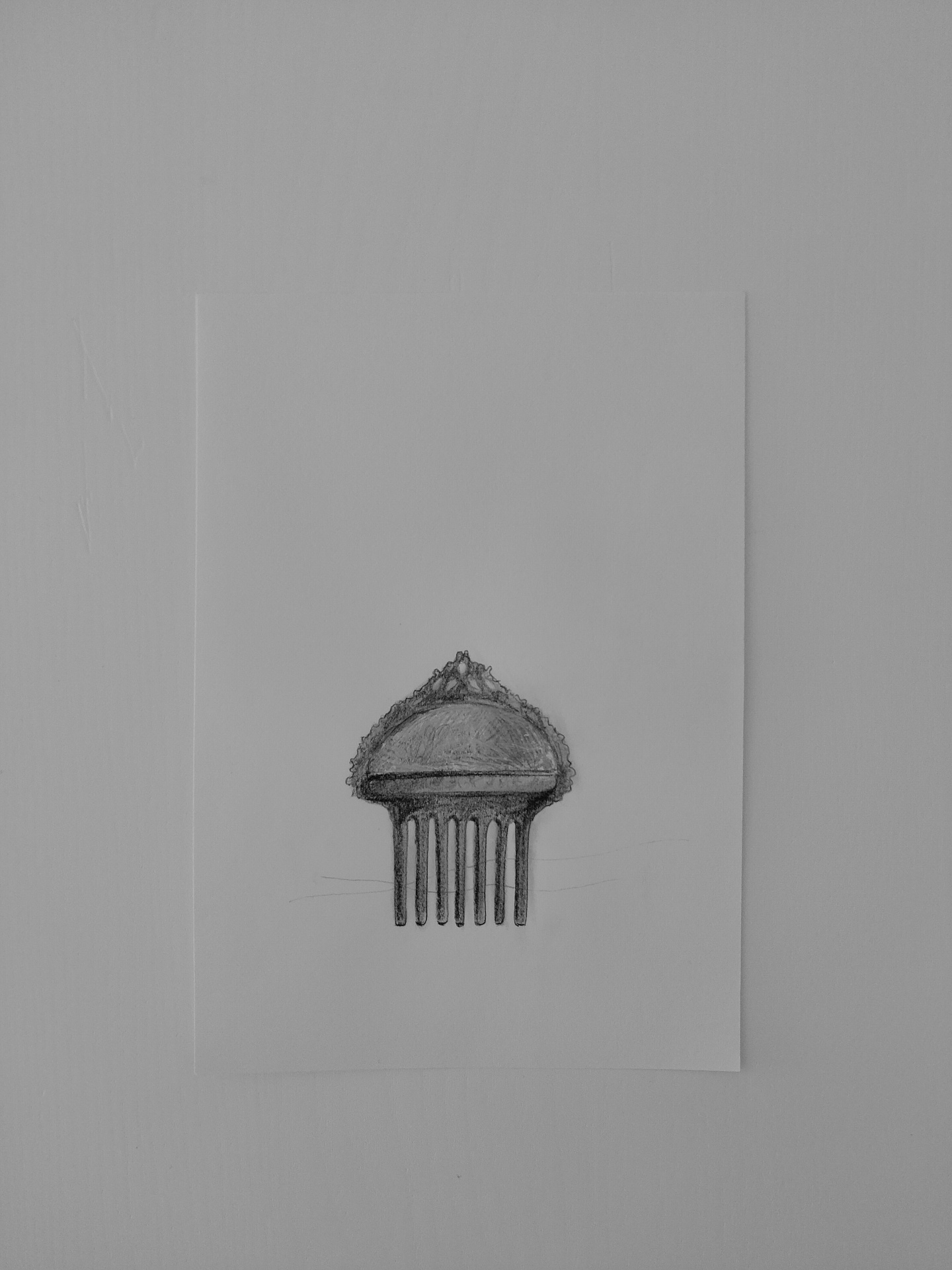 Desenho a lápis de um pente de cabelo em papel branco na parede