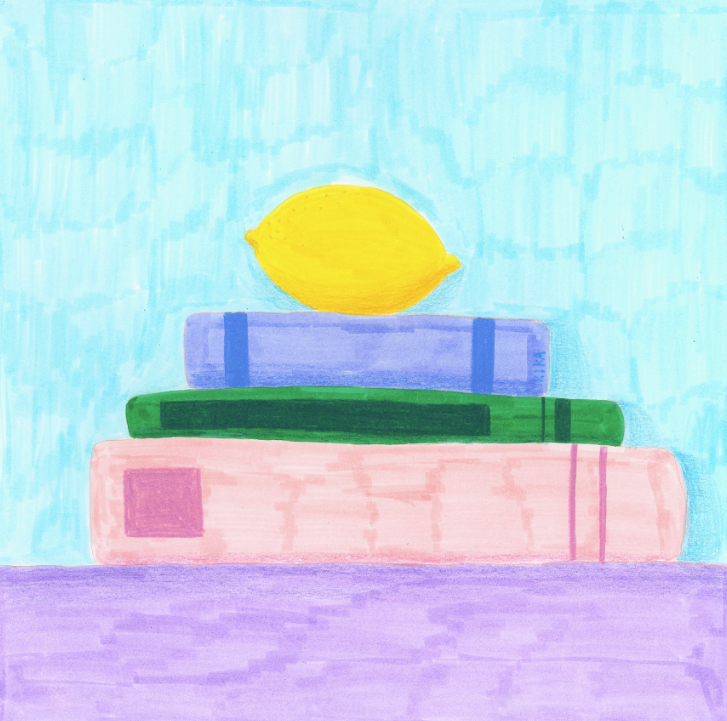 • Ilustração de três livros coloridos empilhados com um limão amarelo em cima
