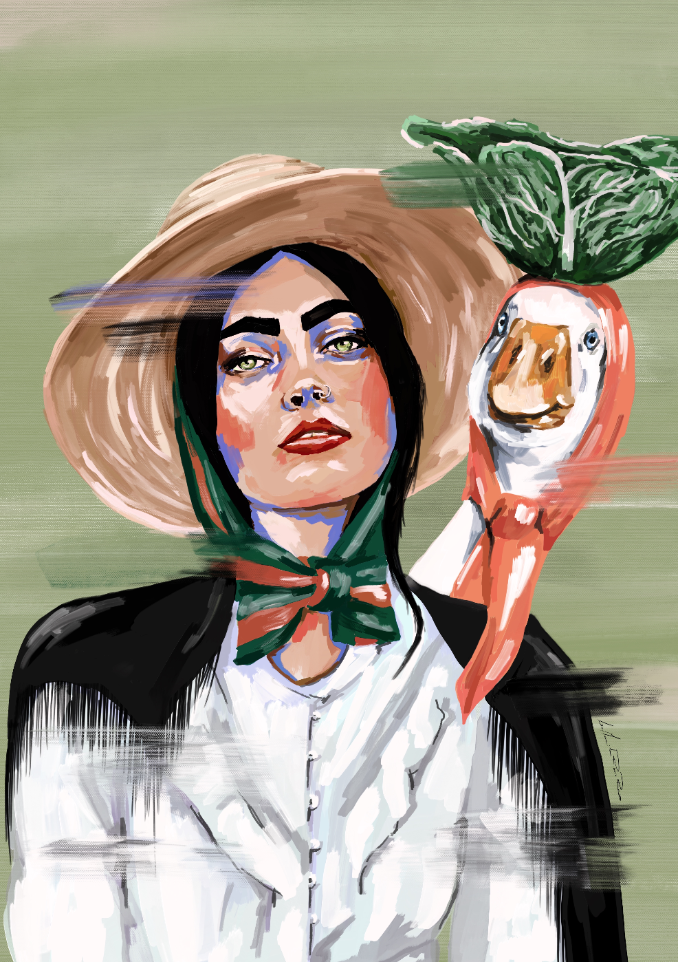 • Ilustração artística de mulher com chapéu e cenoura com rosto
