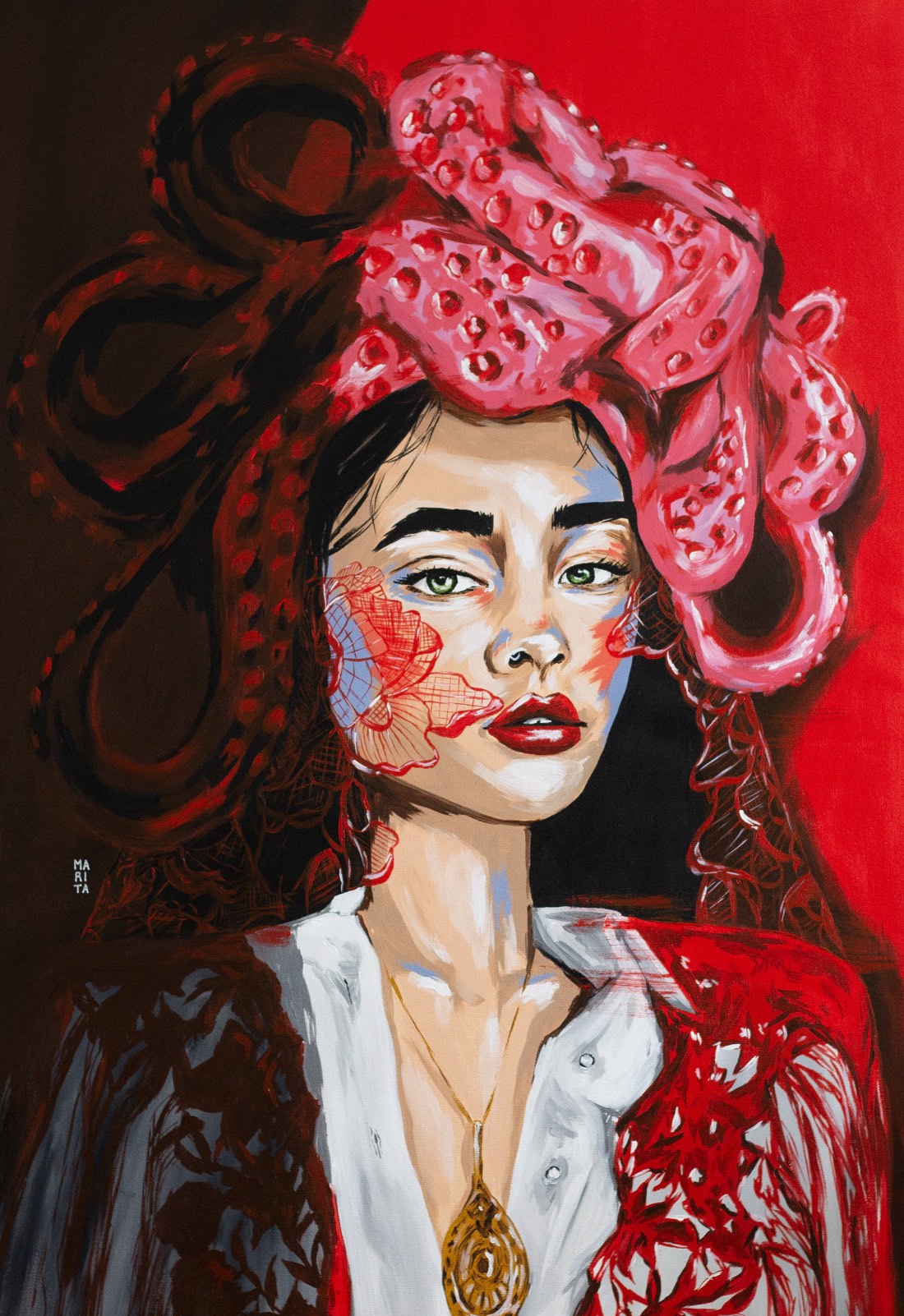 • Pintura de mulher com adereço de cabeça vermelho, colar dourado, camisa branca e casaco vermelho e preto.