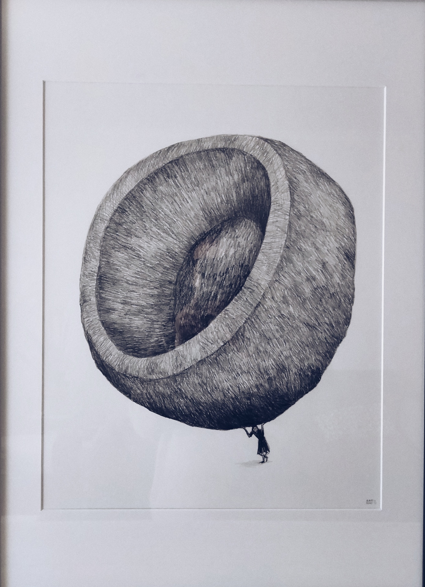 • Desenho a preto e branco de uma pessoa pequena a segurar um grande objecto arredondado e peludo numa moldura branca.
