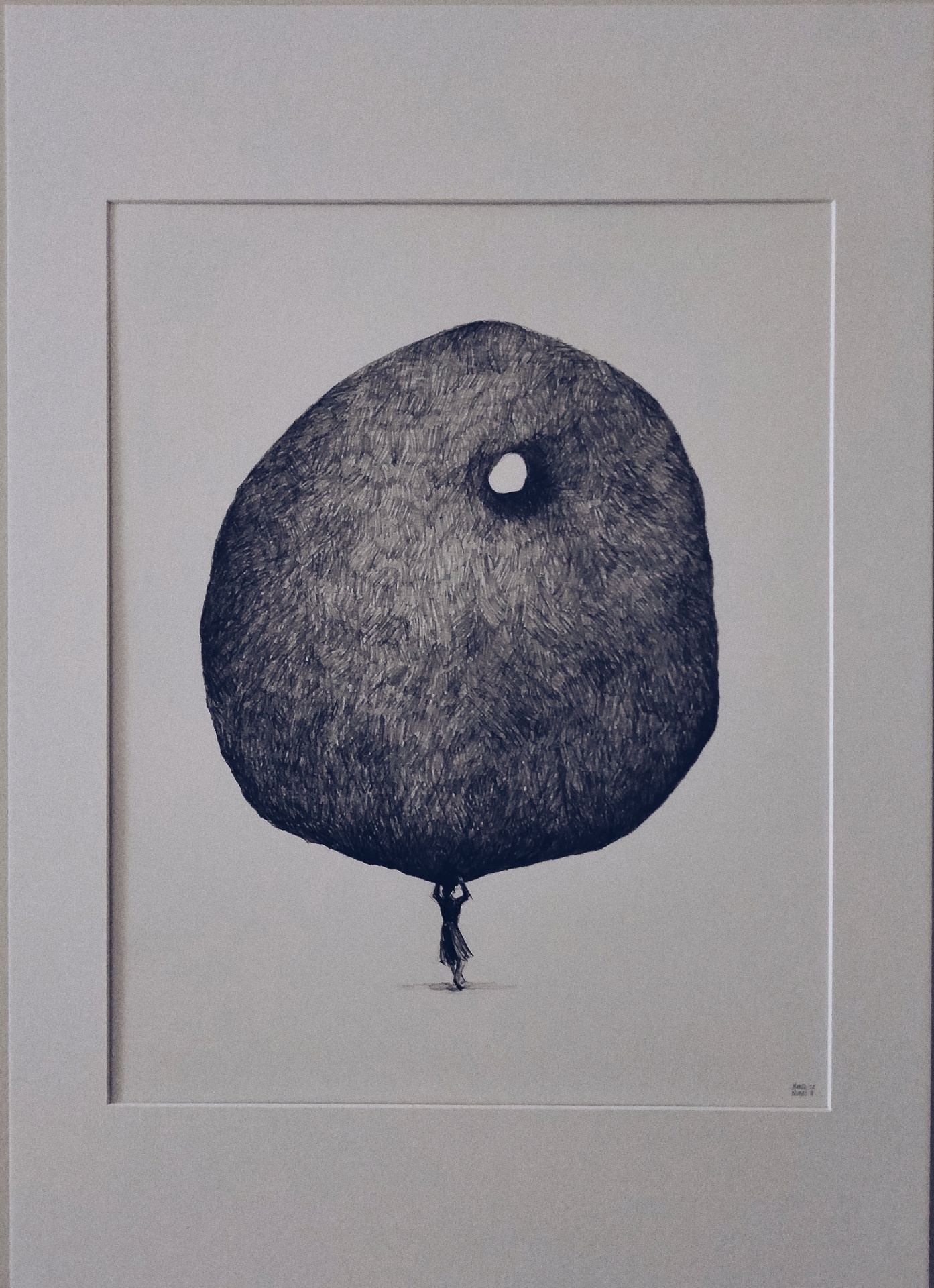 • Desenho a tinta preta de uma figura humana a segurar um balão grande e redondo com um buraco