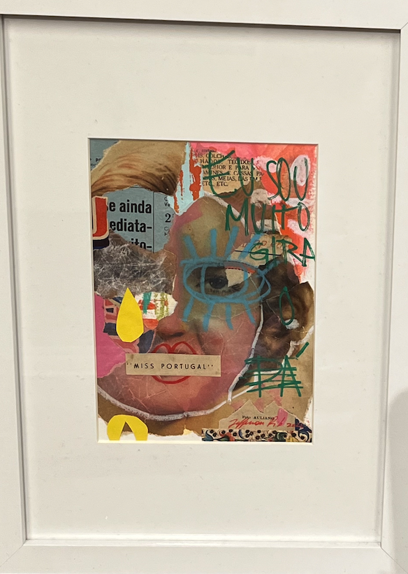 • Colagem emoldurada com rosto pintado, texto manuscrito colorido e recortes de jornal