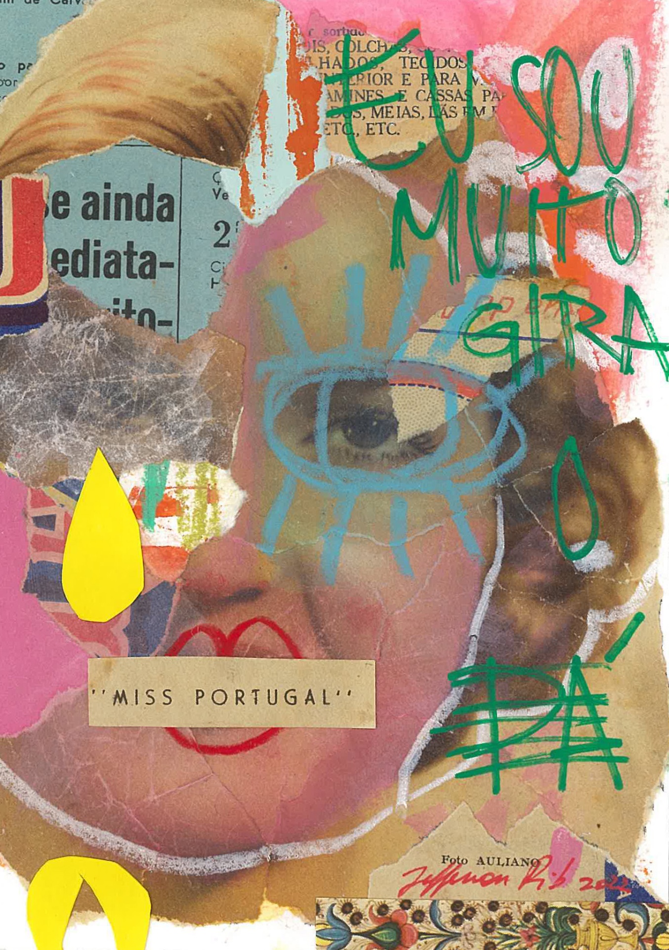 • Colagem artística com rosto feminino, textos em português e elementos coloridos.