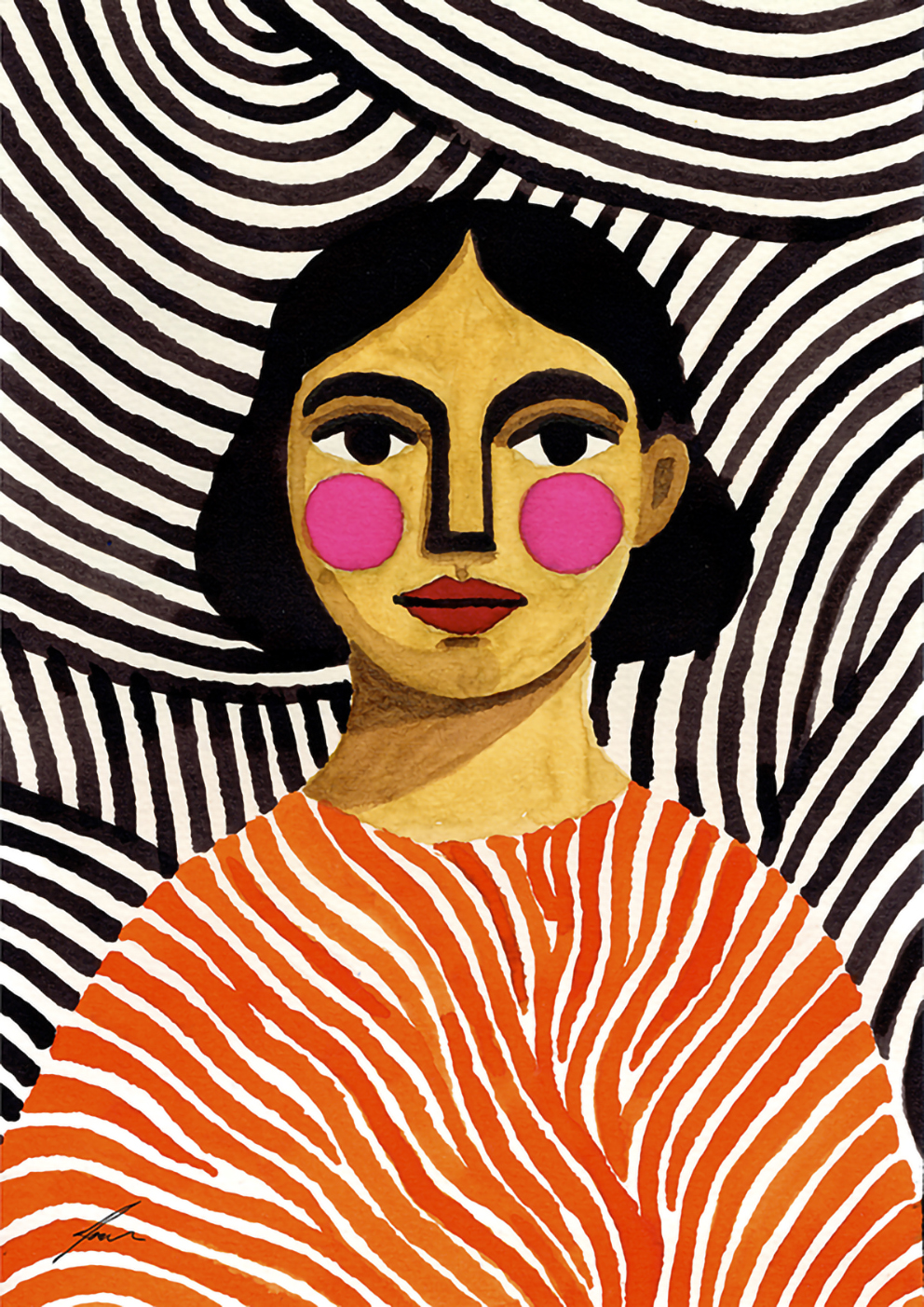 Pintura estilizada de mulher com cabelo preto, roupa laranja listrada, fundo abstrato em preto e branco