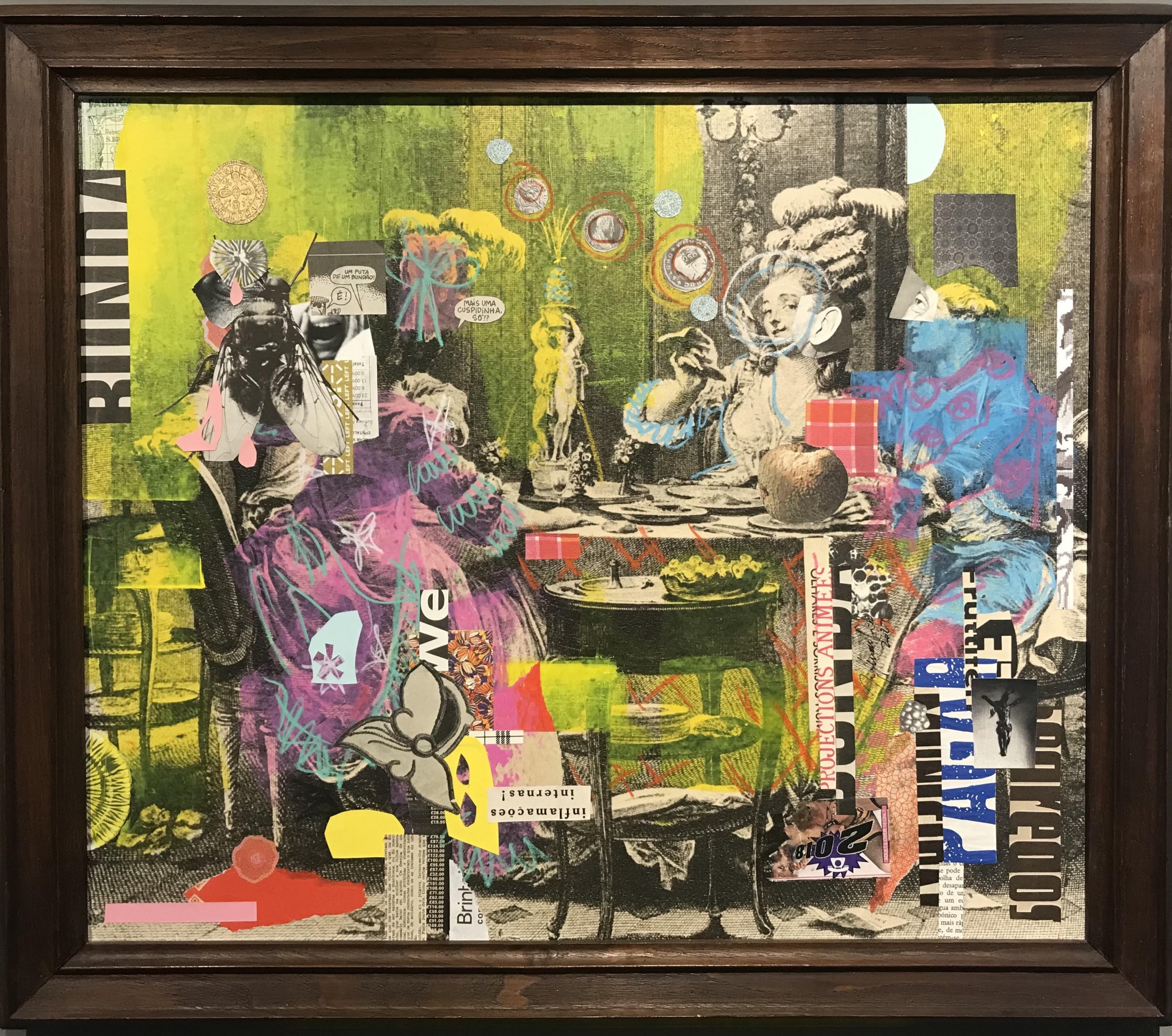 obra com moldura em madeira, colagem, pastel, tinta acrílica