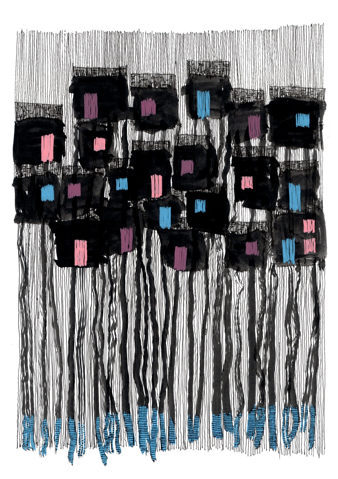 • Tecido decorativo com padrão geométrico em preto, rosa e azul sobre fundo branco