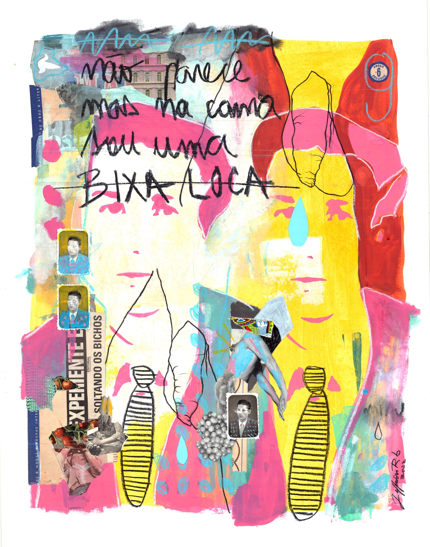 • Colagem artística com formas humanas e texto manuscrito em cores vibrantes