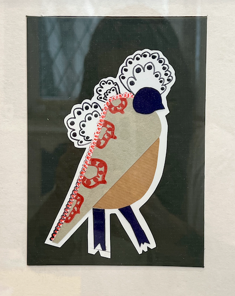 • Figura de pássaro feita de recortes de papel colorido e padrão num fundo preto