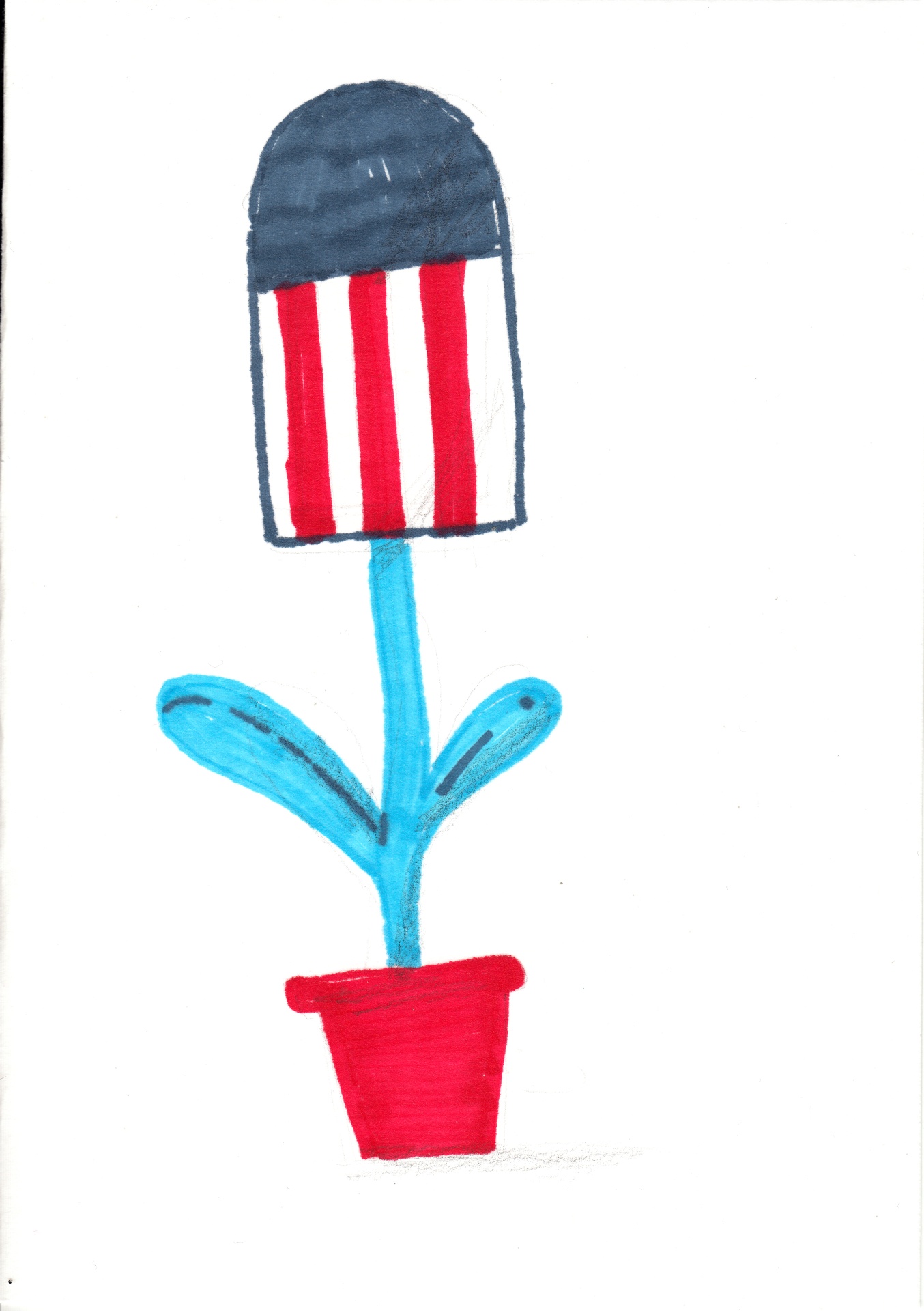 • Desenho de planta com vaso vermelho, caule e folhas azuis e flor colorida
