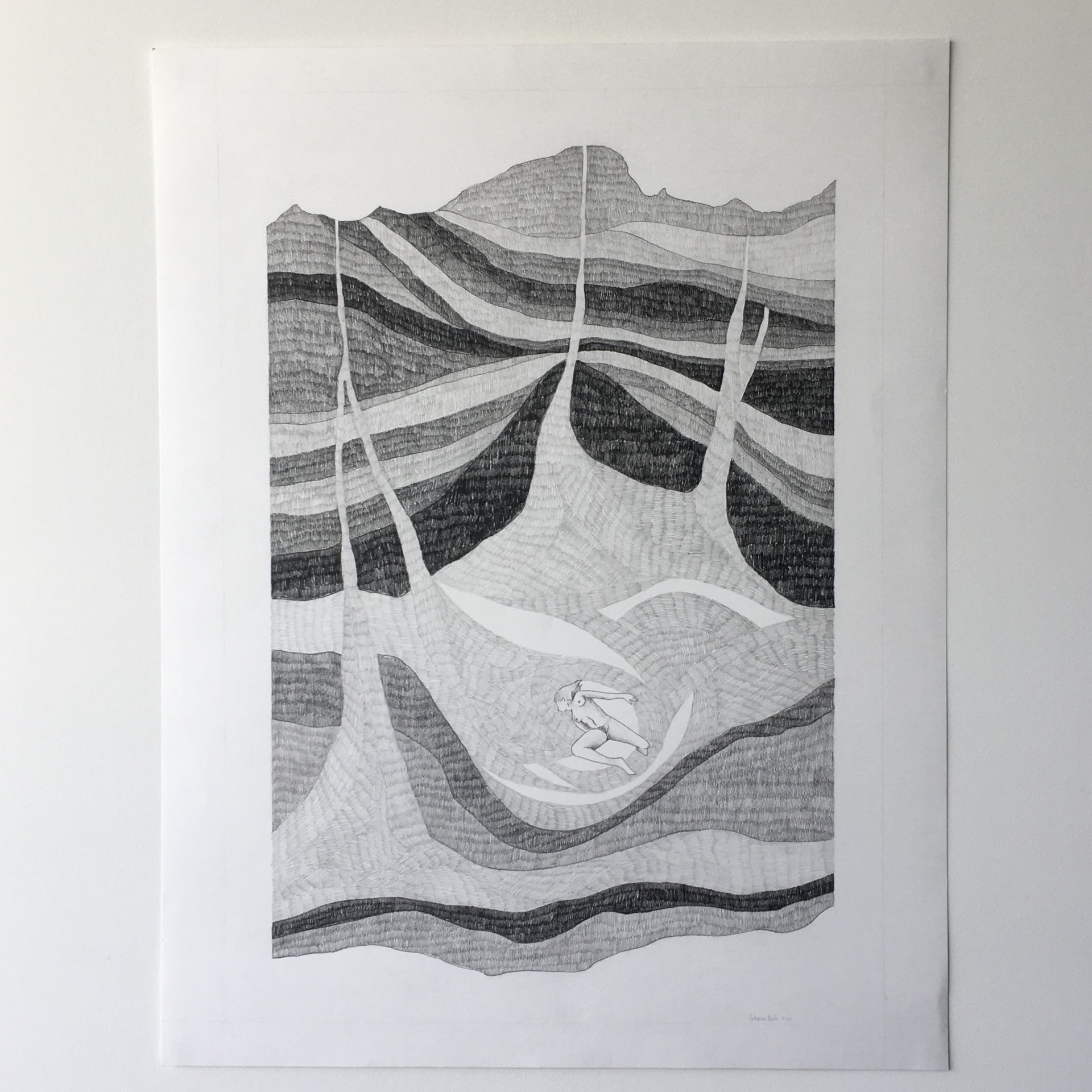 • Desenho a preto e branco com padrões ondulados e figura humana central