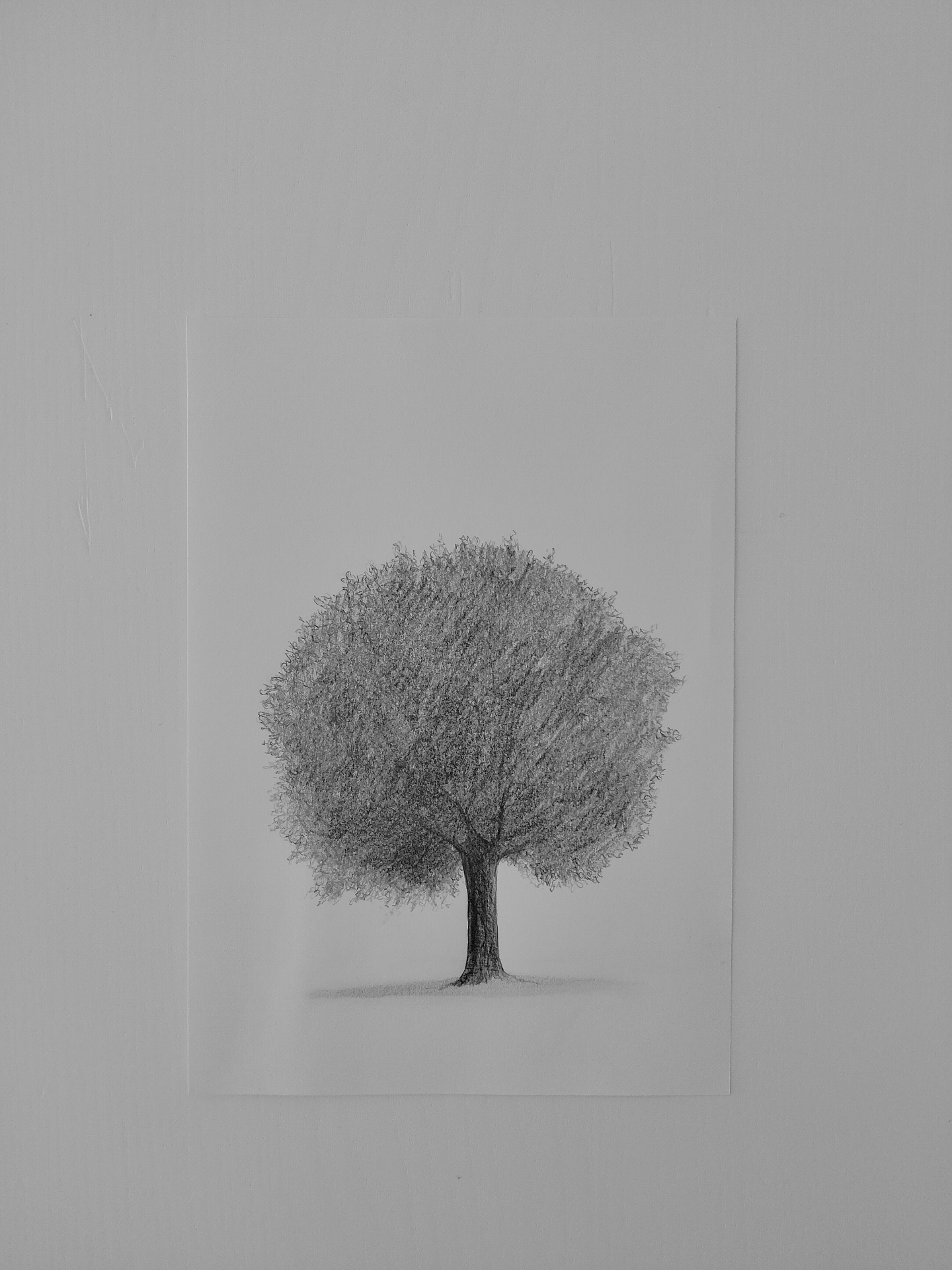 • Desenho a preto e branco de uma árvore num papel branco numa parede cinzento claro