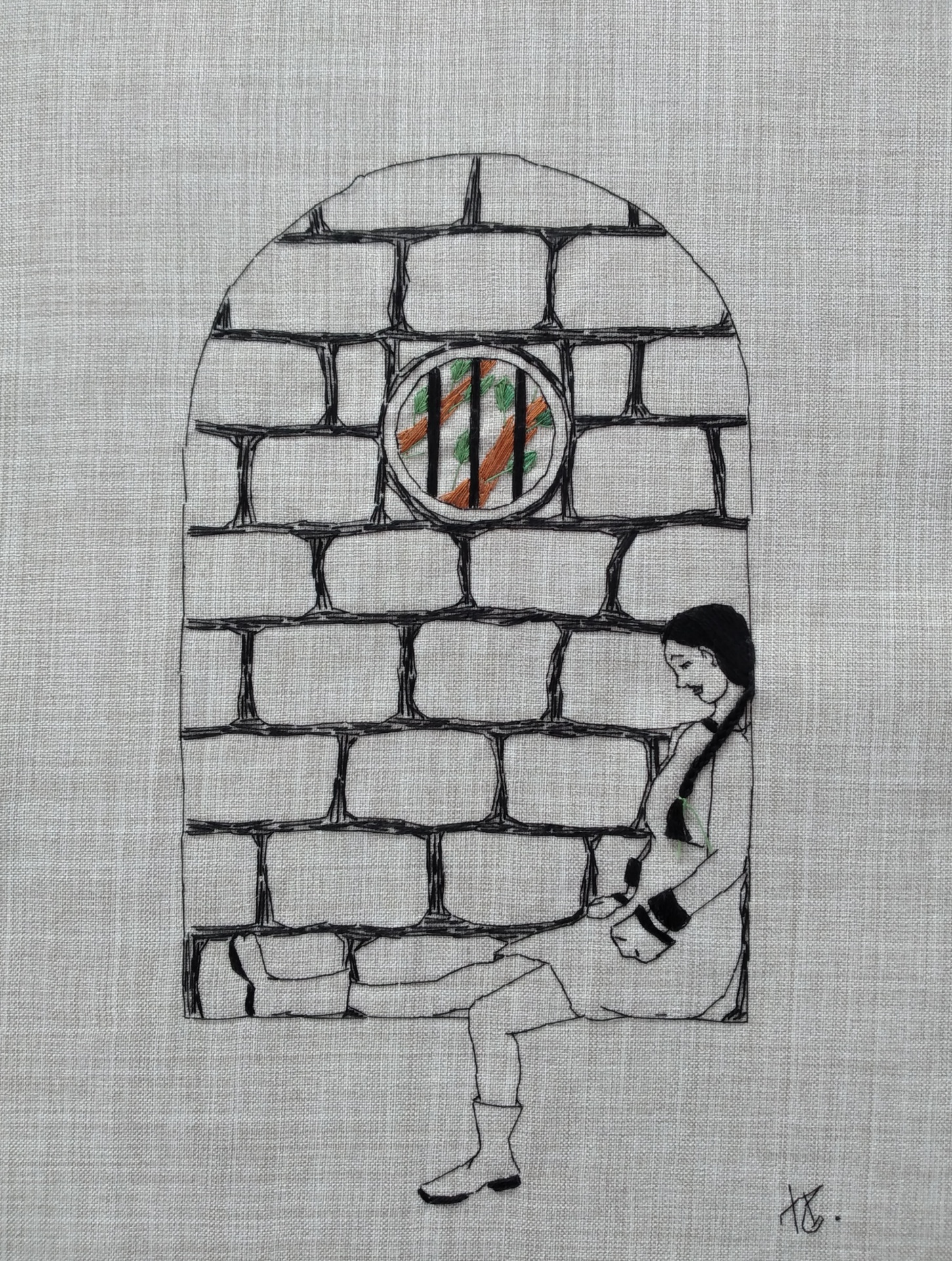 Desenho bordado de pessoa sentada junto a parede de pedra com janela circular
