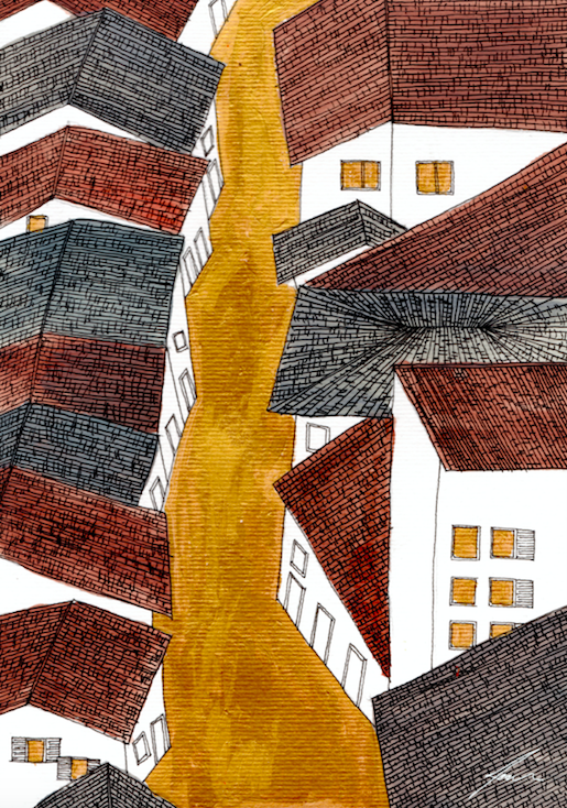 Fachadas numa desordem organizada e nas ruas tortuosas, recantos com casinhas harmoniosamente desencontradas ou uma combinação inesperada de céu e terra. Muitas vezes banhadas por luas e sóis que se derramam sobre um emaranhado de ruas e casas com graça.
