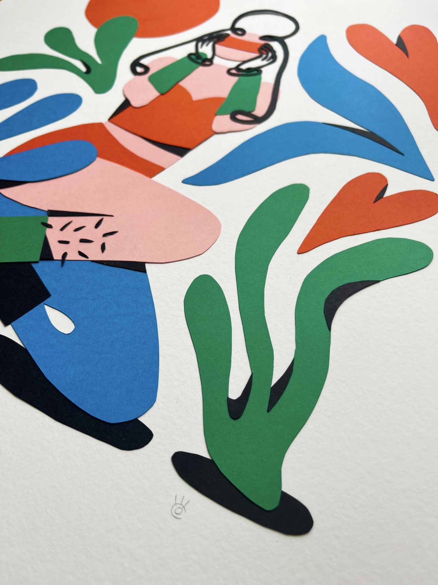 • Ilustração recortada em papel colorido com figuras abstratas e plantas