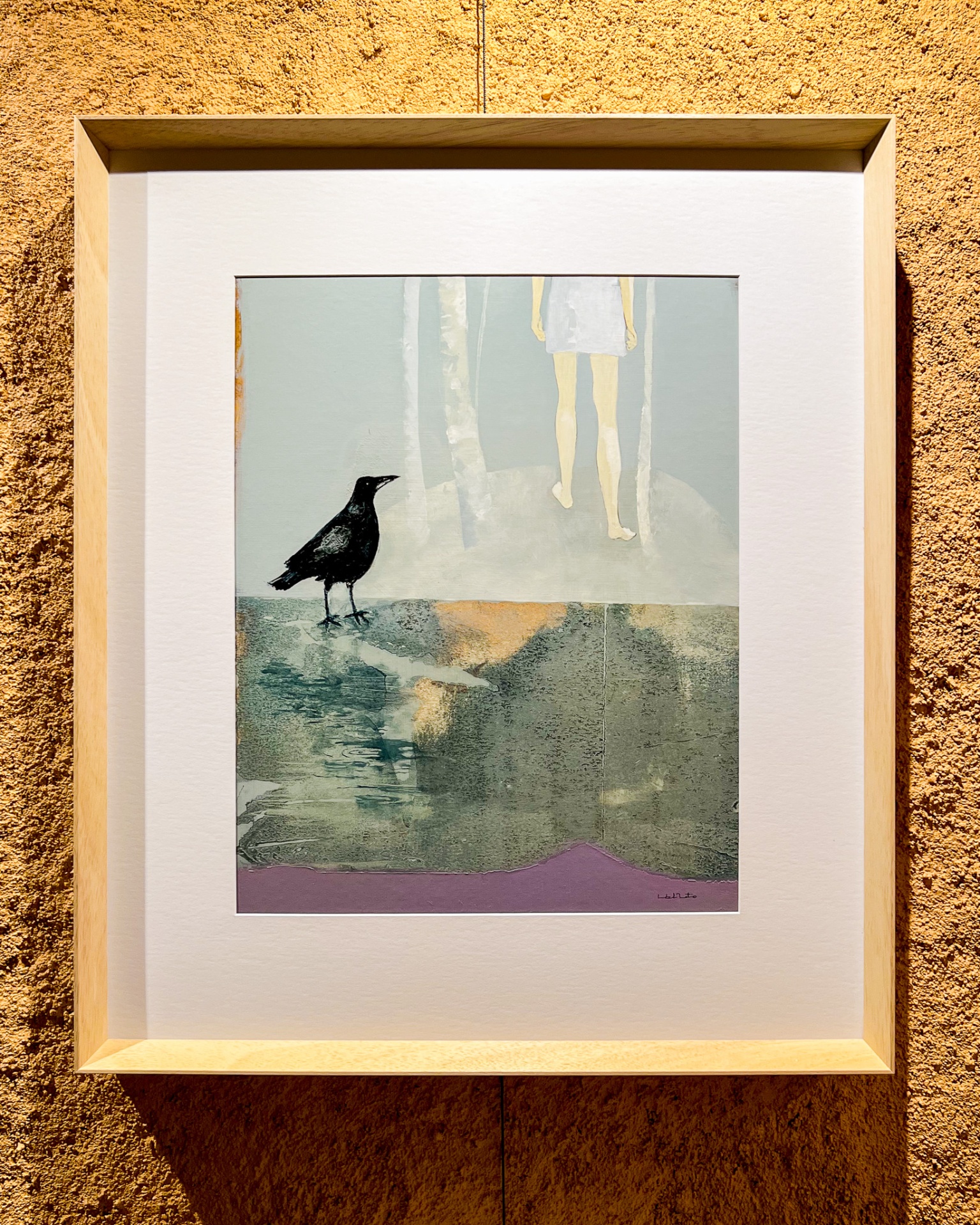 • Quadro arte com corvo preto e figura humana na moldura madeira clara