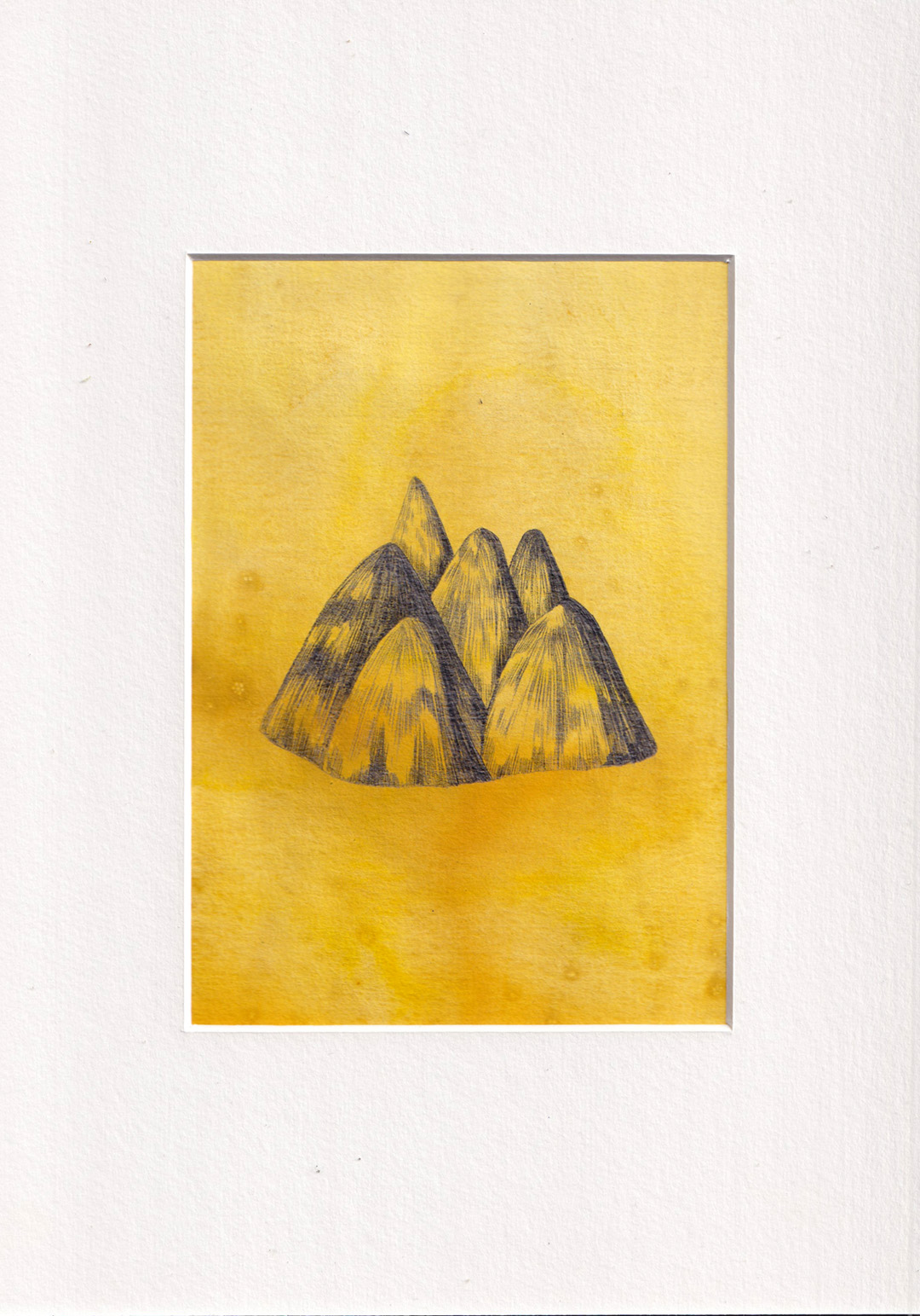 • Pintura de montanhas estilizadas em amarelo e negro sobre fundo amarelo com moldura branca